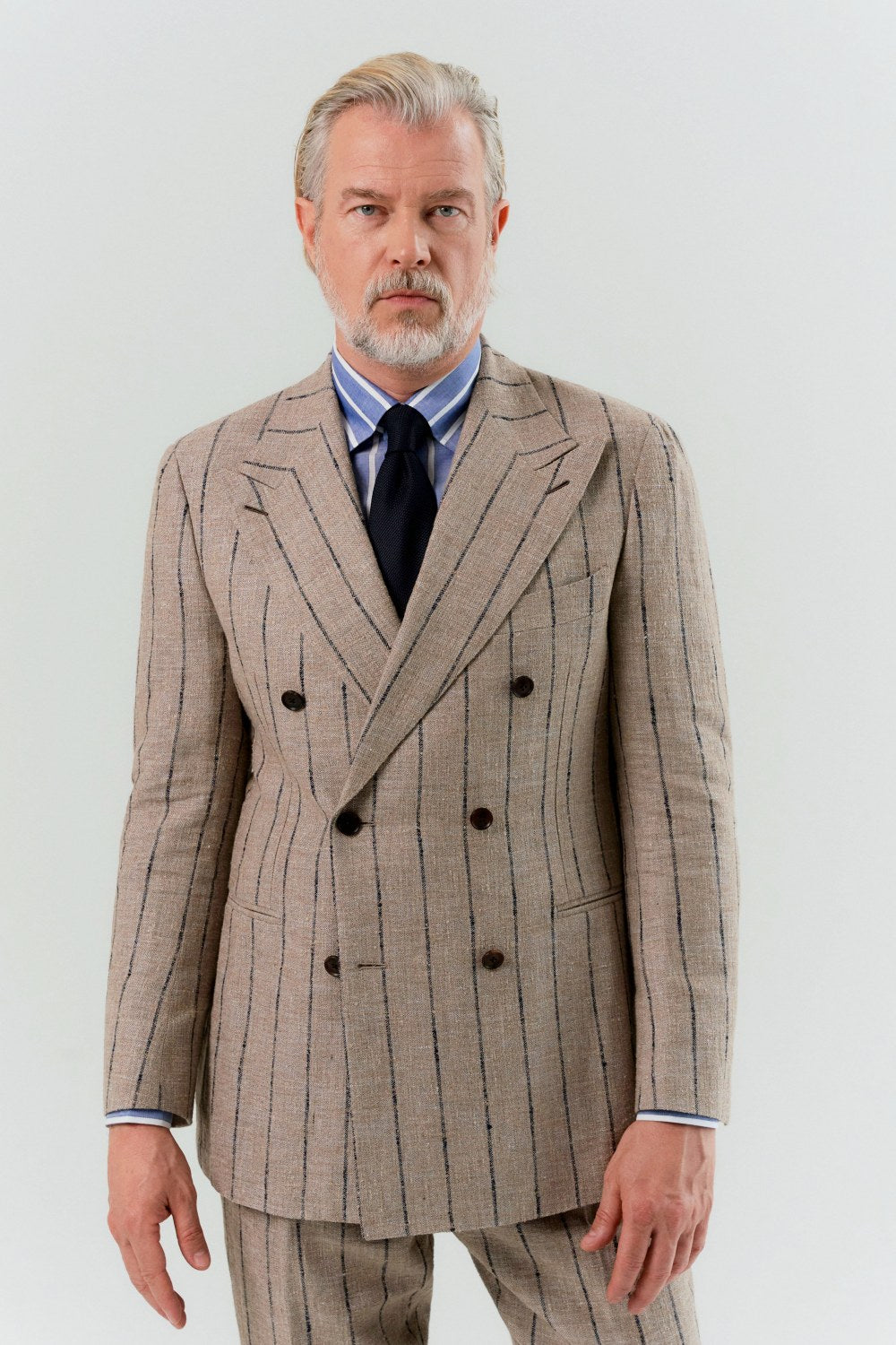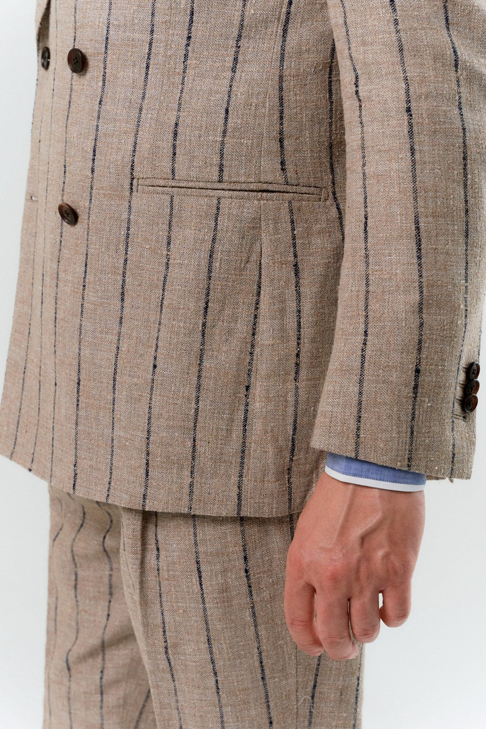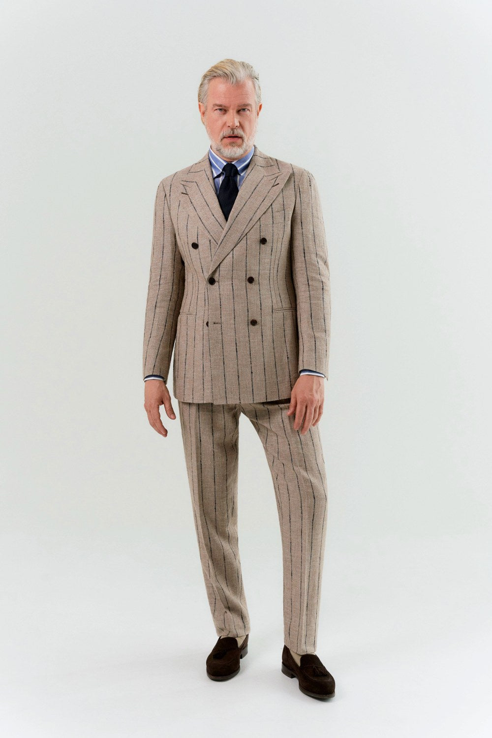 A suit made of a unique fabric from Italian brand Ferl is perfect proof that a business pinstripe can be exceptional. The unique fabric means you can wear it without any obligation or special occasion. This exclusive suit with a unique design is the answer for lovers of traditional form and tailoring who want to emphasize their attention to detail. A beige pinstripe suit is a great option for the spring and summer season, sure to make your outfit stand out.
