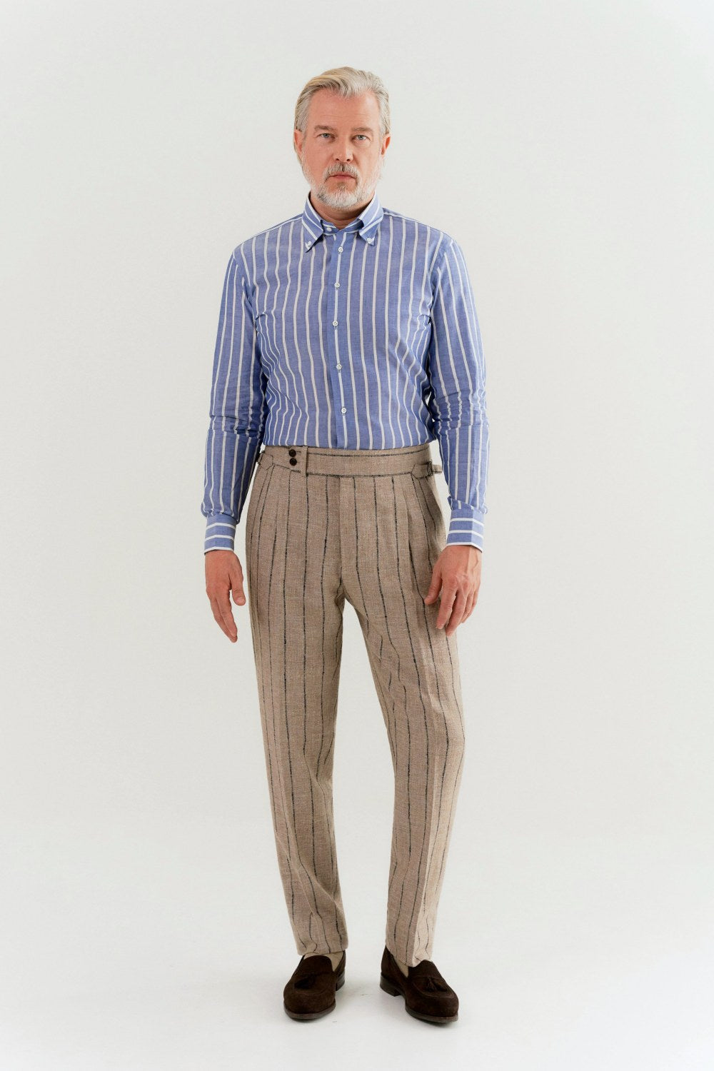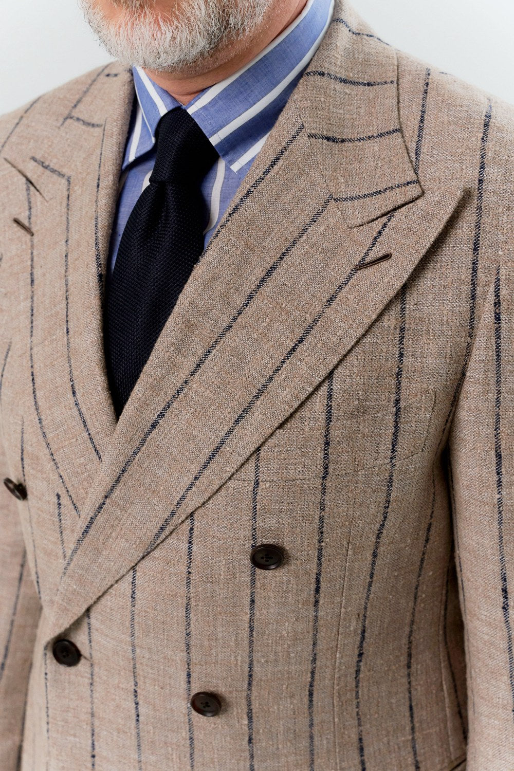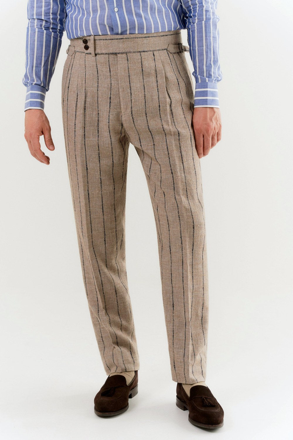 A suit made of a unique fabric from Italian brand Ferl is perfect proof that a business pinstripe can be exceptional. The unique fabric means you can wear it without any obligation or special occasion. This exclusive suit with a unique design is the answer for lovers of traditional form and tailoring who want to emphasize their attention to detail. A beige pinstripe suit is a great option for the spring and summer season, sure to make your outfit stand out.