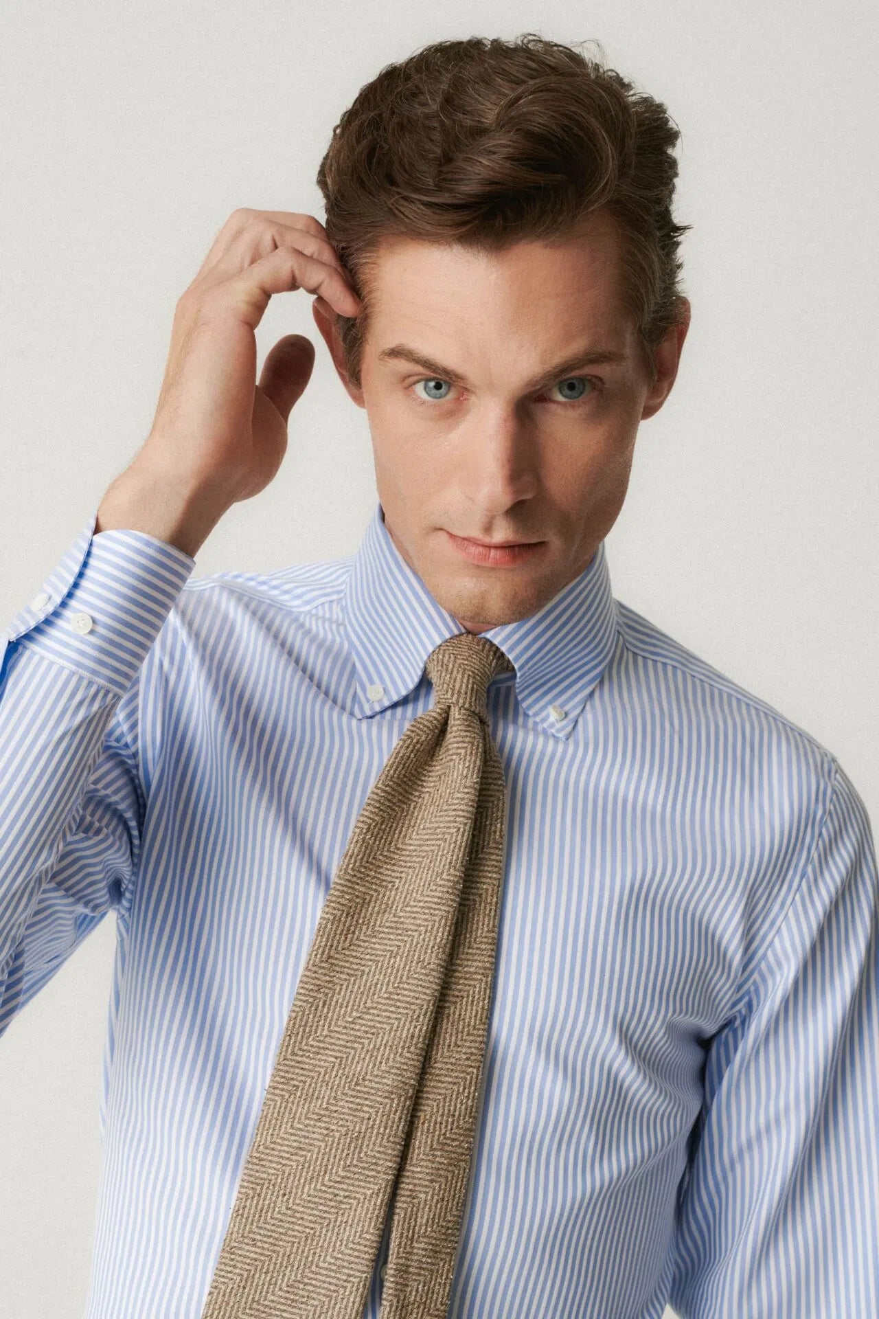 A classic, blue striped "OCBD" shirt with rounded cuffs, a flat placket and a button-down collar. Crafted of 100% Albini cotton, 120/135g, with an oxford structure. The shirt itself has been manufactured in Poland, ensuring high-quality craftsmanship.