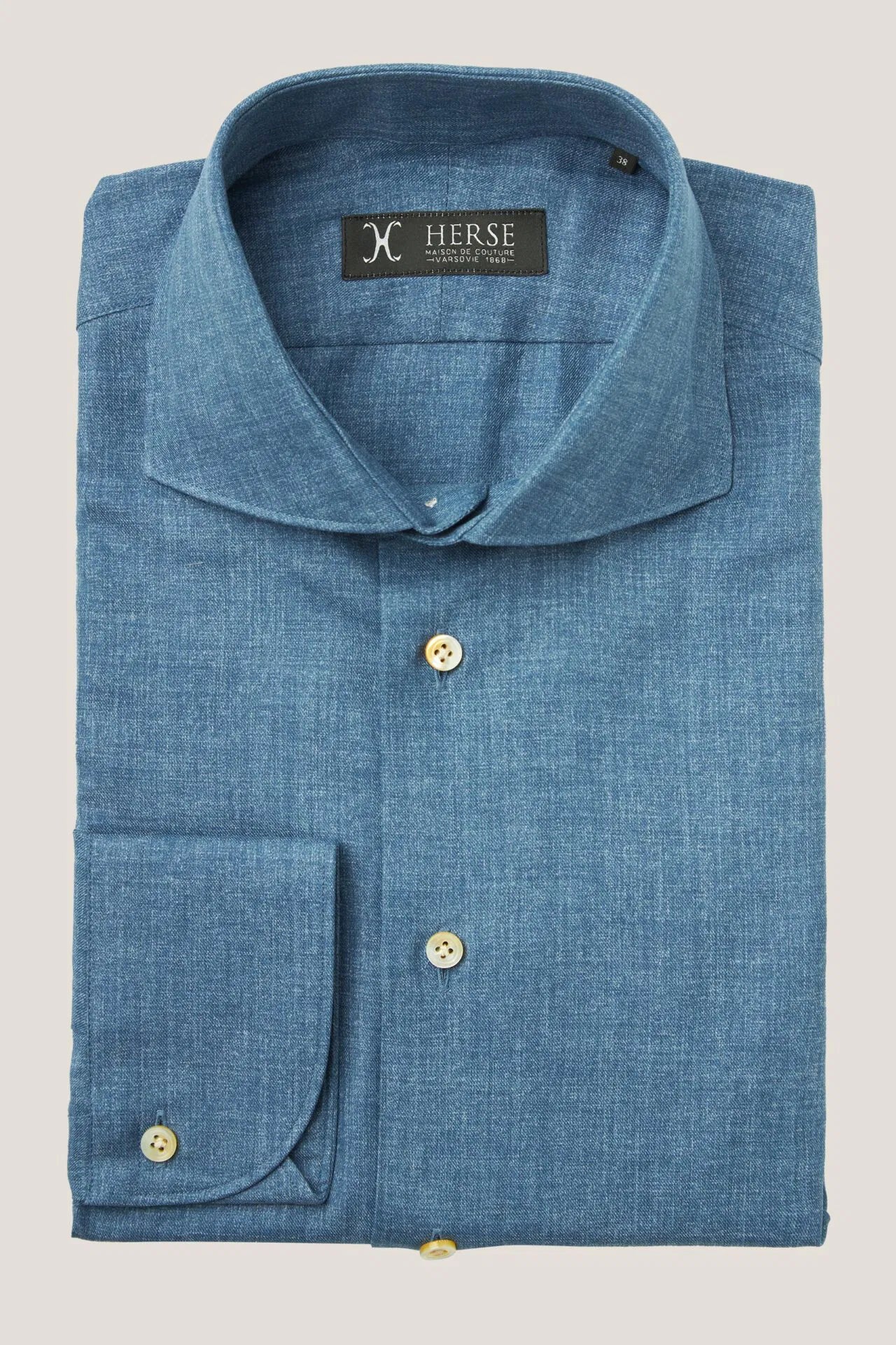 Our denim shirt is a classic design with a cutaway collar. It's crafted of a fine-weave cotton denim from luxury manufacturer Carlo Riva. Made in Poland, the shirt guarantees high quality. Available in two colors.