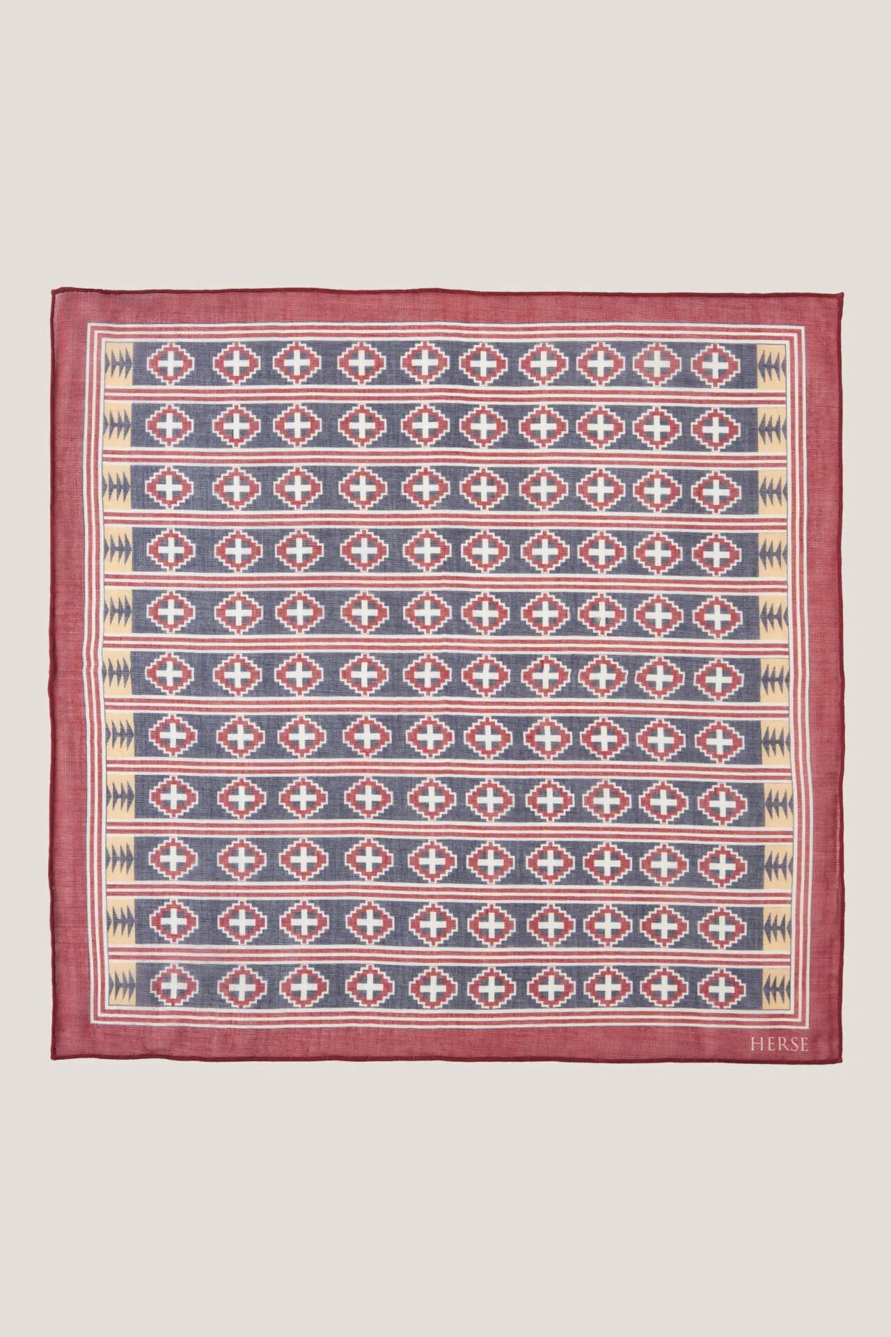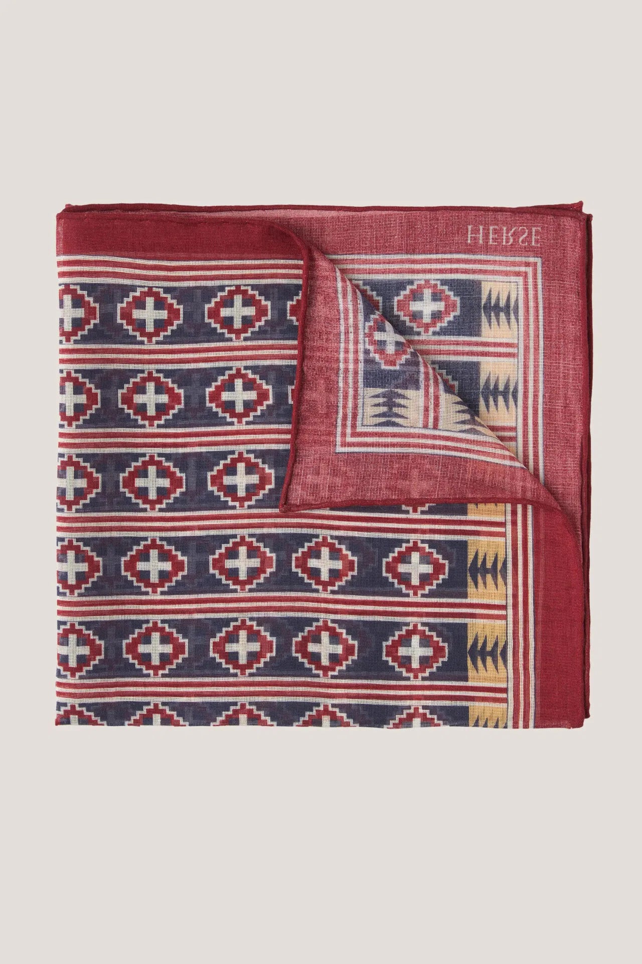 Navy blue-burgundy pocket square with a horizontal ethnic pattern