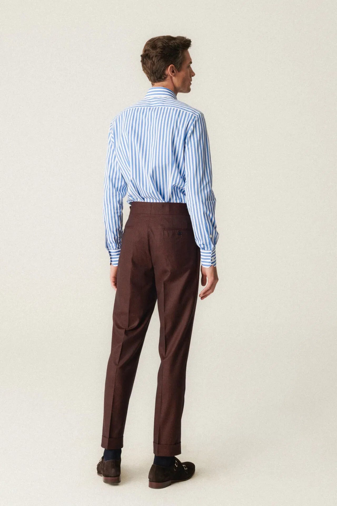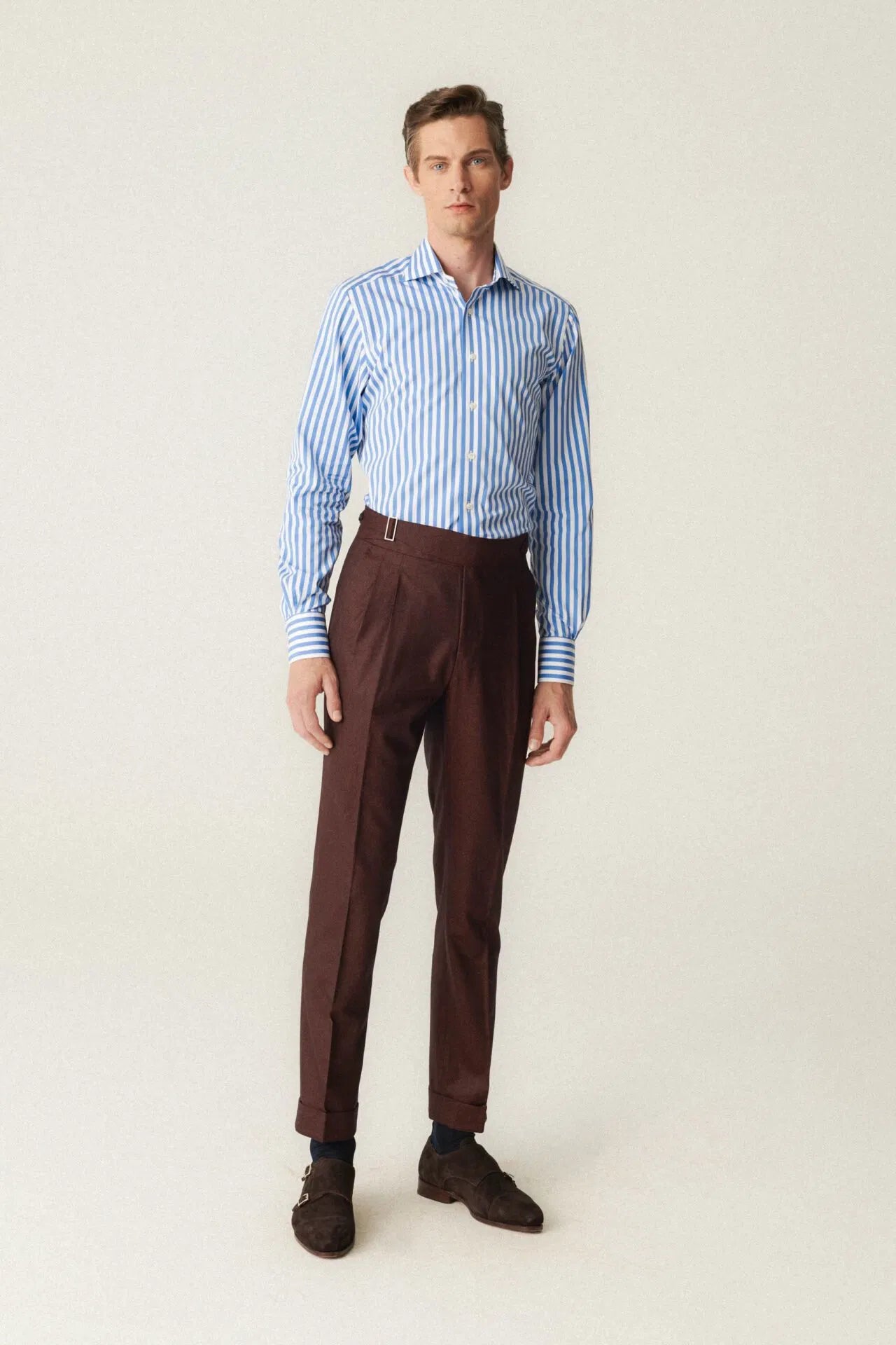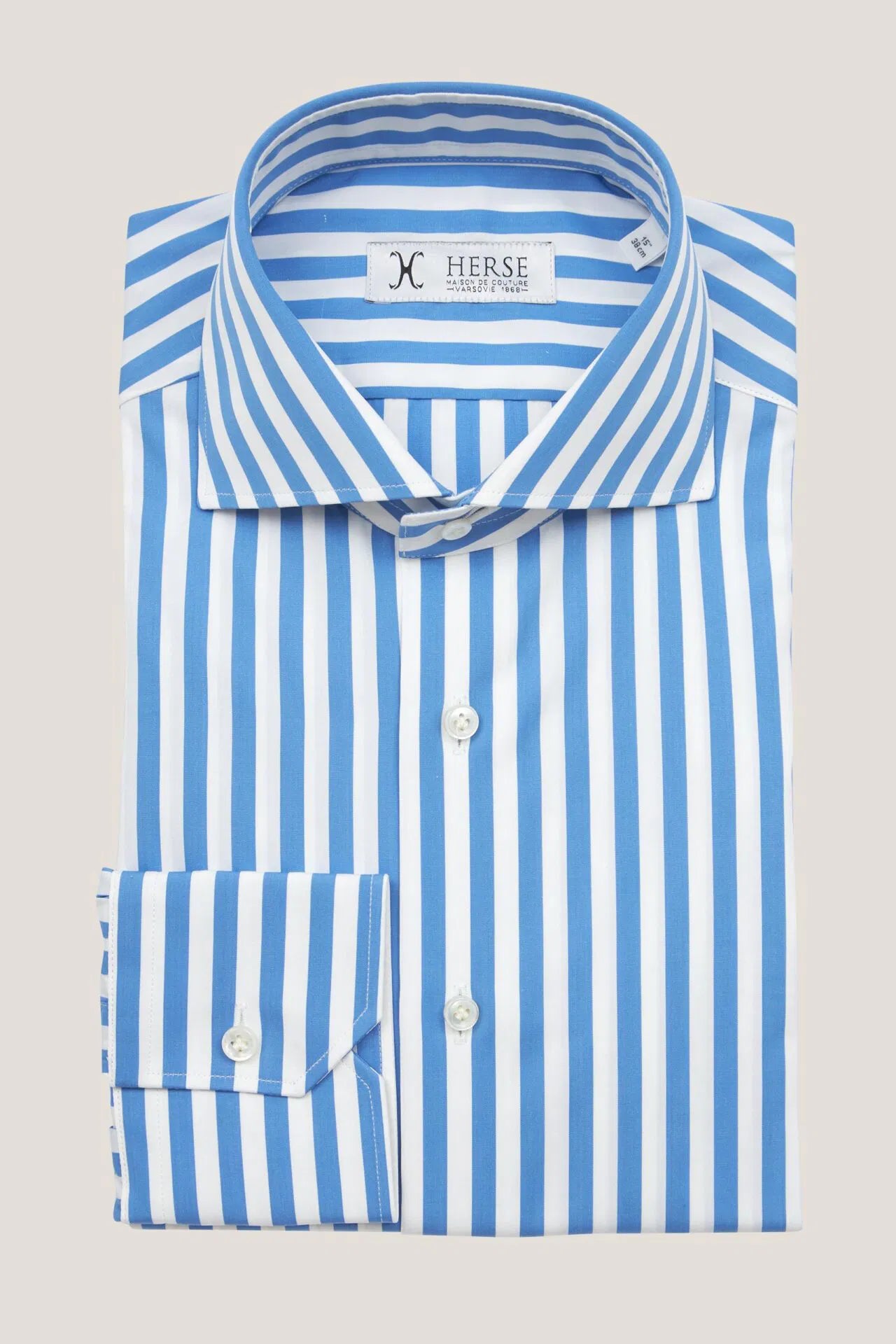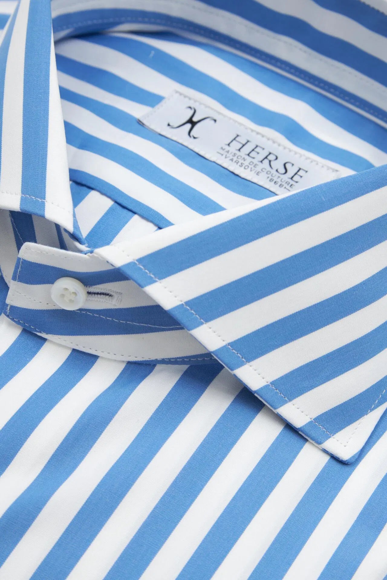 Our shirt with a widespread collar is a versatile everyday option. It's made of 118/127g white and blue cotton. The fabric comes from the renowned manufacturer Thomas Mason. The shirt itself was created in Poland, in one of the world's best sewing workshops. The cut of the shirt is not overly fitted, but highlites the silhouette.