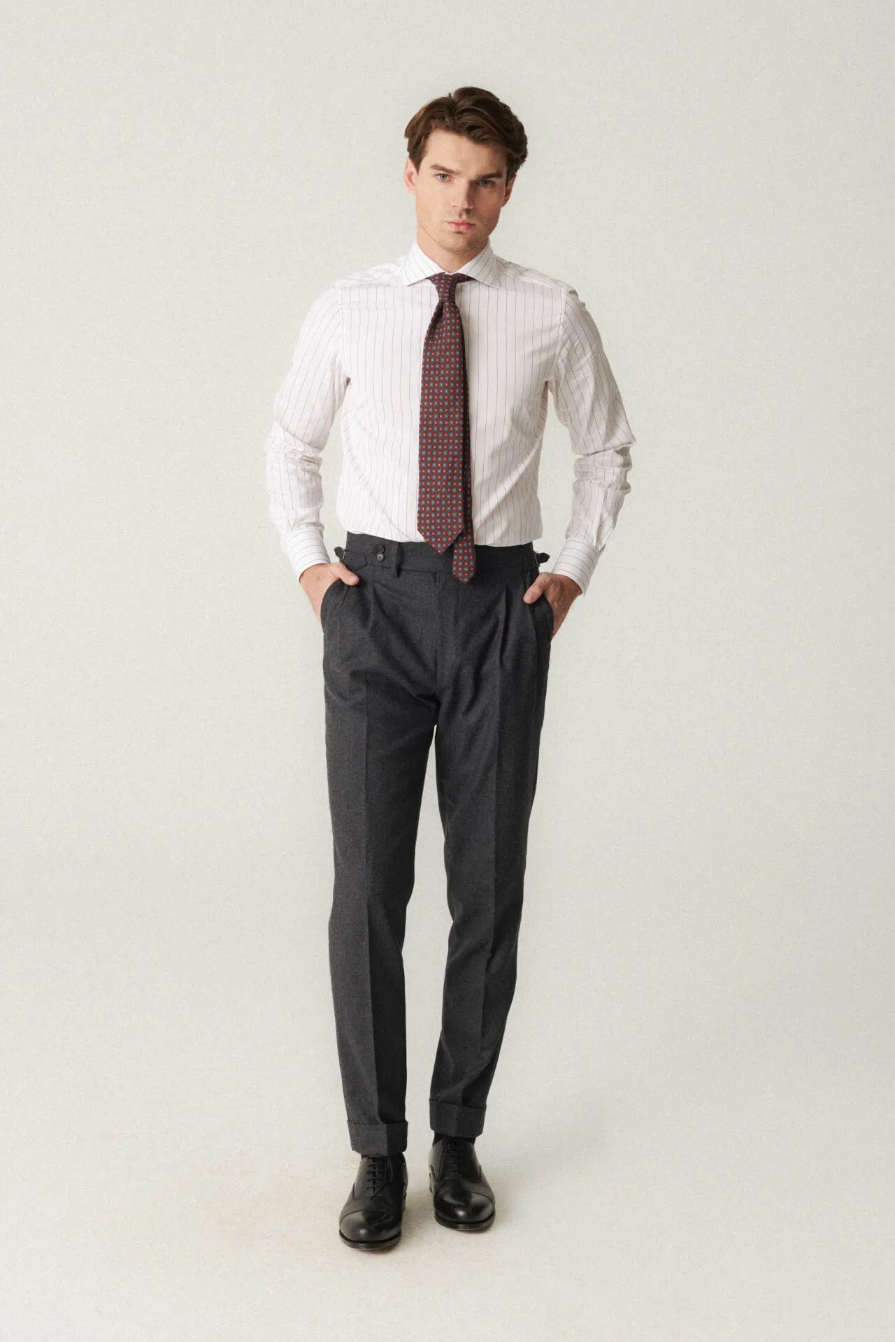 Świetna jakość wełny, spodnie są idealnie uszyte, widać dbałość o detale. Szeroki pas spodni jest dużo lepszym rozwiązaniem niż zakładanie paska, a do tego wygląda efektownie. Polecam.