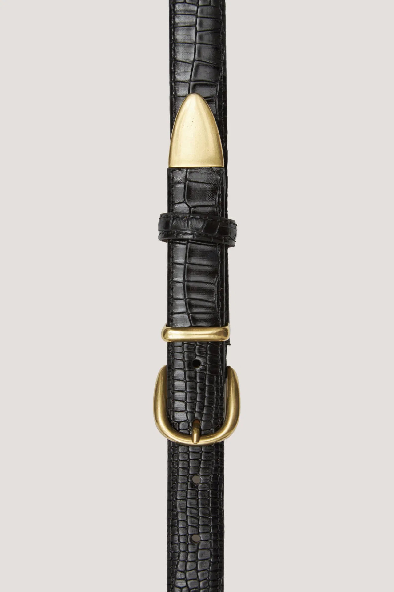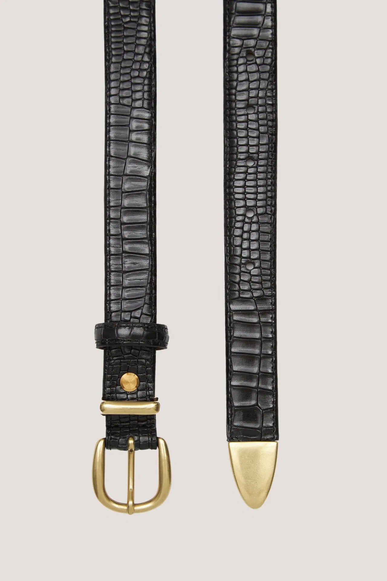 Une ceinture classique en cuir noir de 2,5 cm de large, à la texture unique. Confectionnée en cuir de vache, elle est parfaite pour les tenues décontractées et leur apporte une touche vintage.