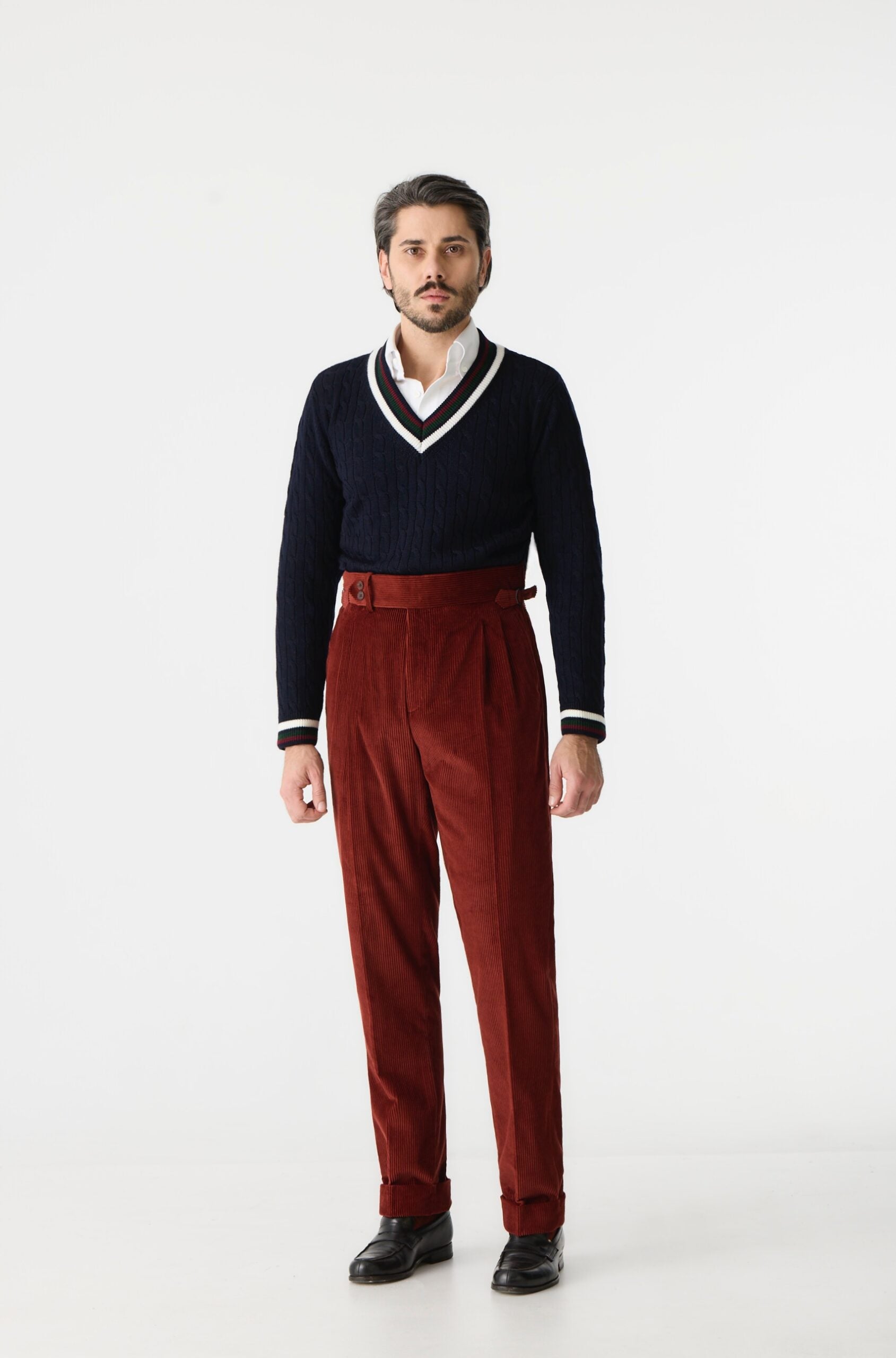 Notre costume en velours côtelé rouge brique est un choix unique alliant élégance et décontraction. Confectionné en 100 % coton de haute qualité avec une touche de cachemire, sa texture douce lui confère un caractère unique. Parfait pour l'automne et le printemps, il attire tous les regards grâce à son esthétique et sa couleur uniques.
