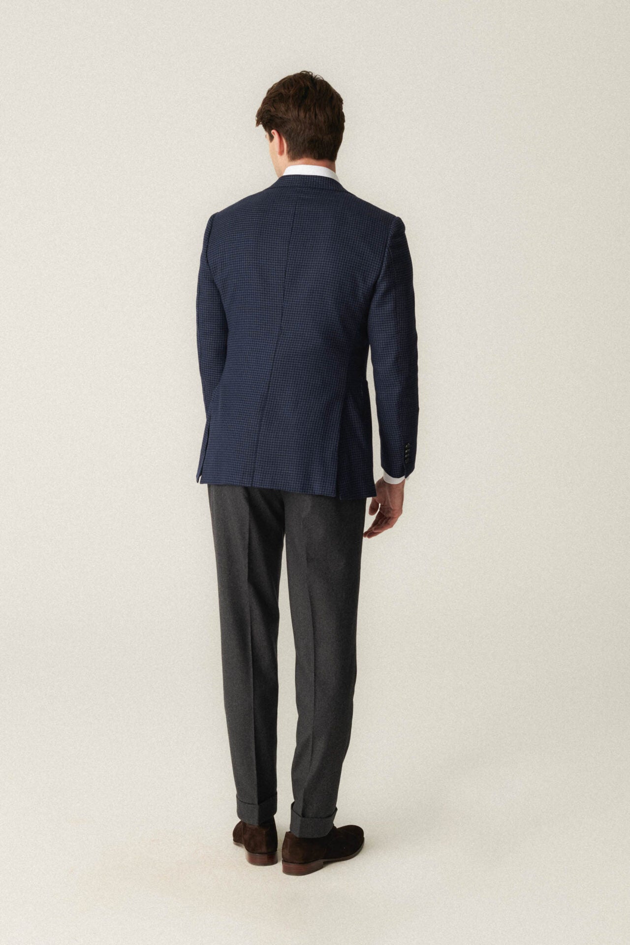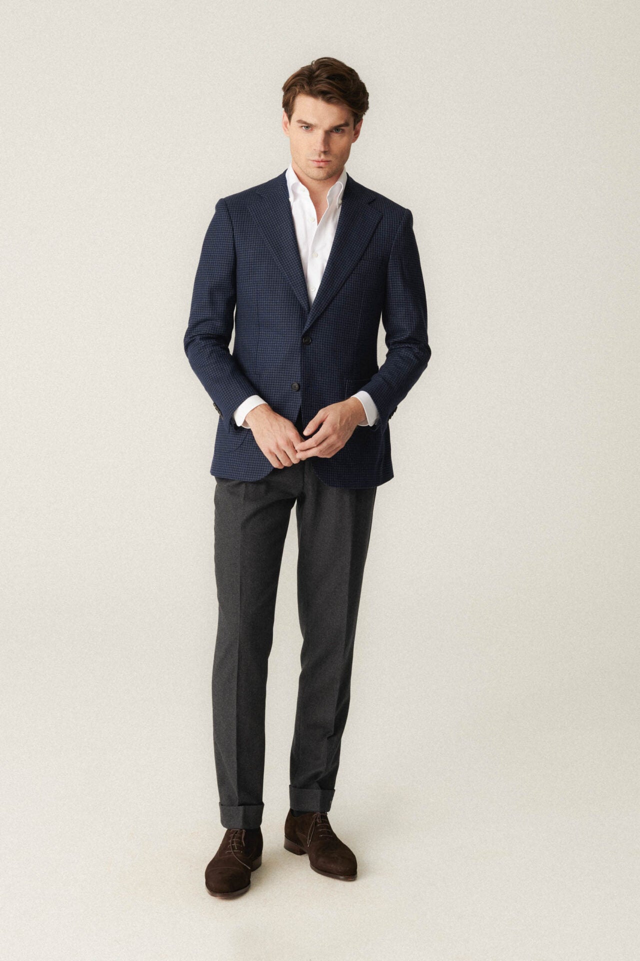 DÉTAILS : poches plaquées en forme de gobelet, entièrement doublé, rembourrage minimal aux épaules, revers crantés de 10 cm