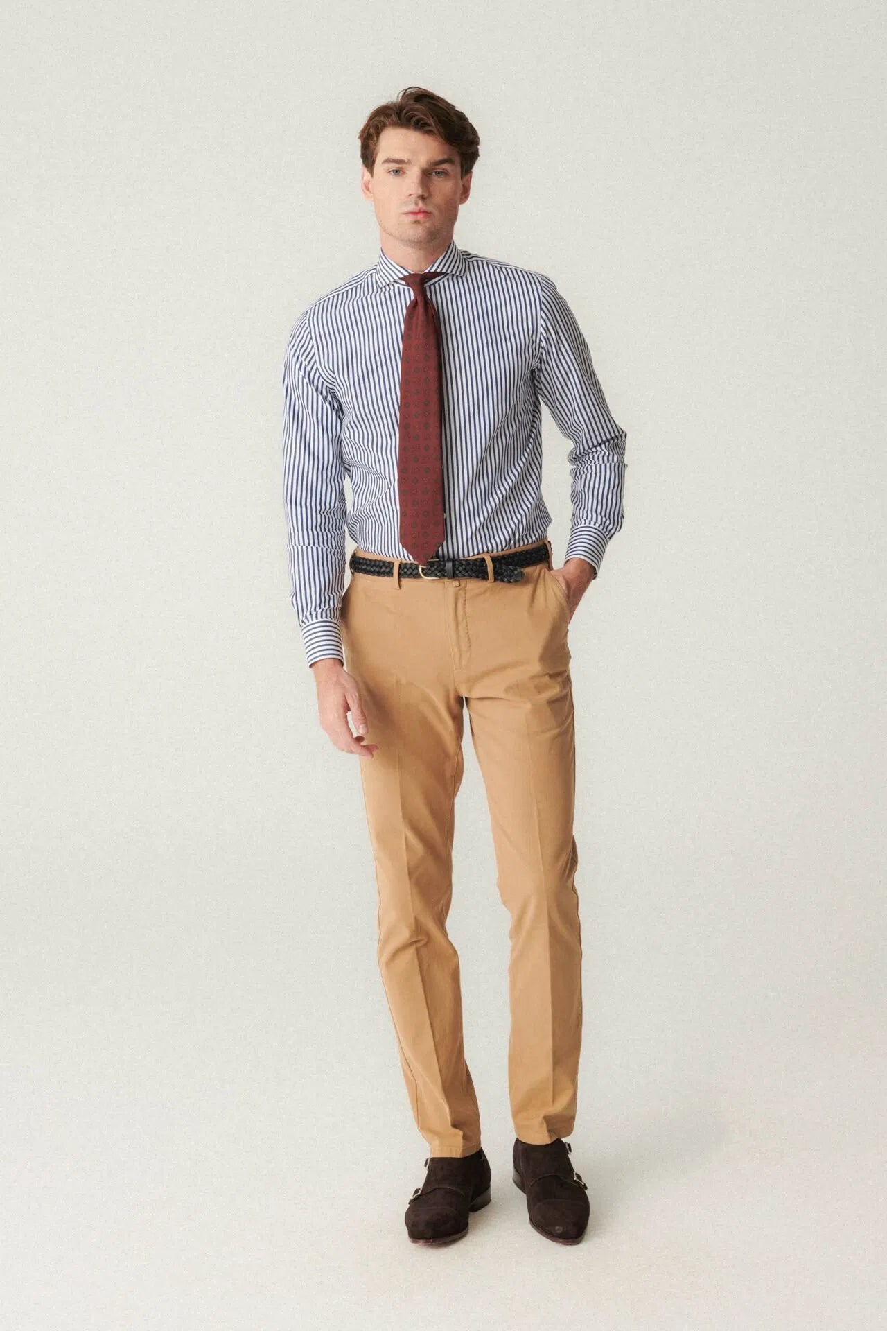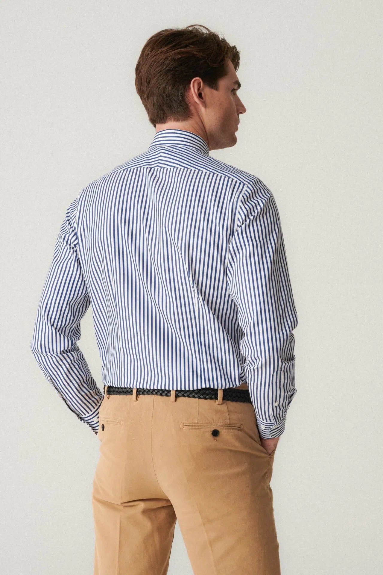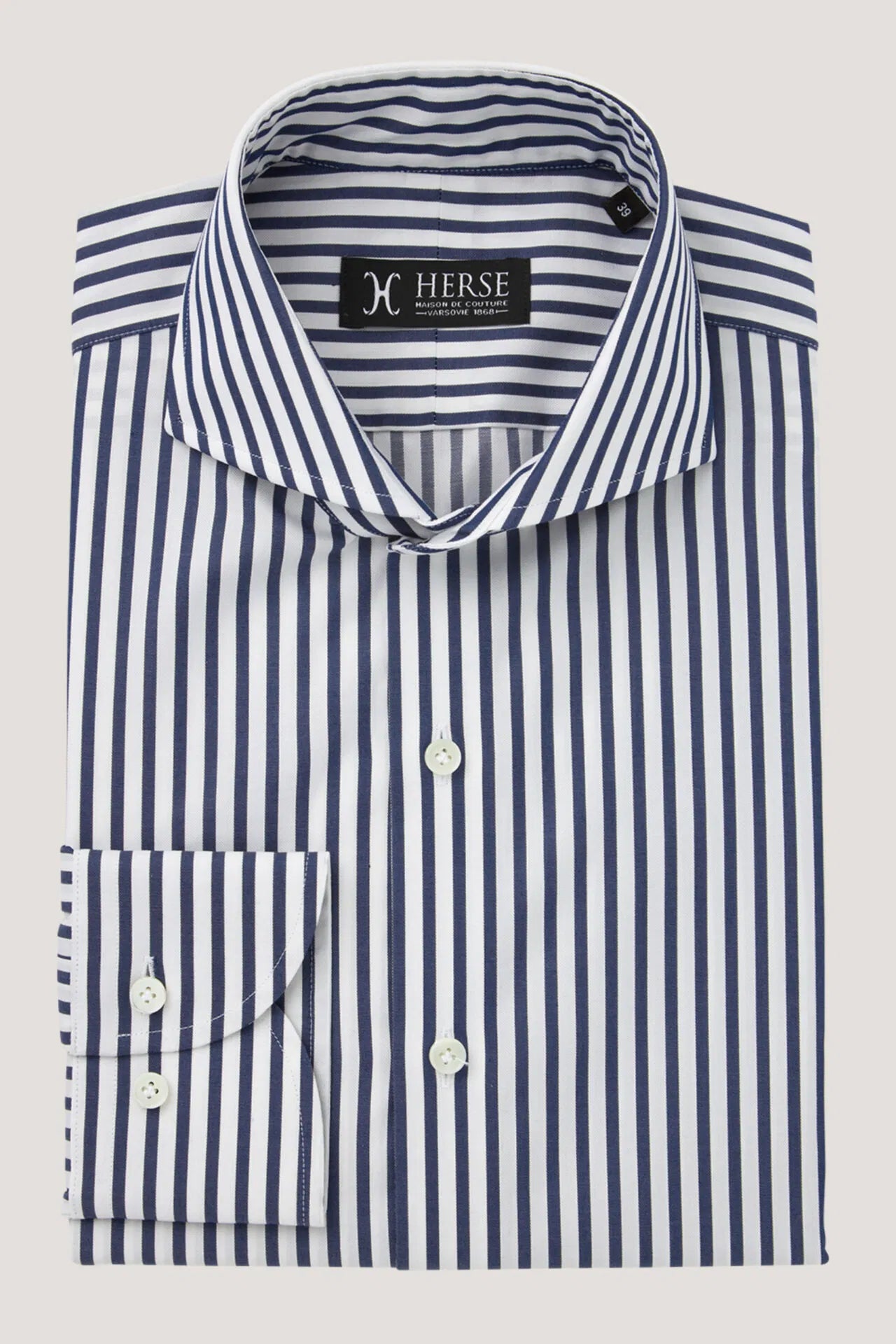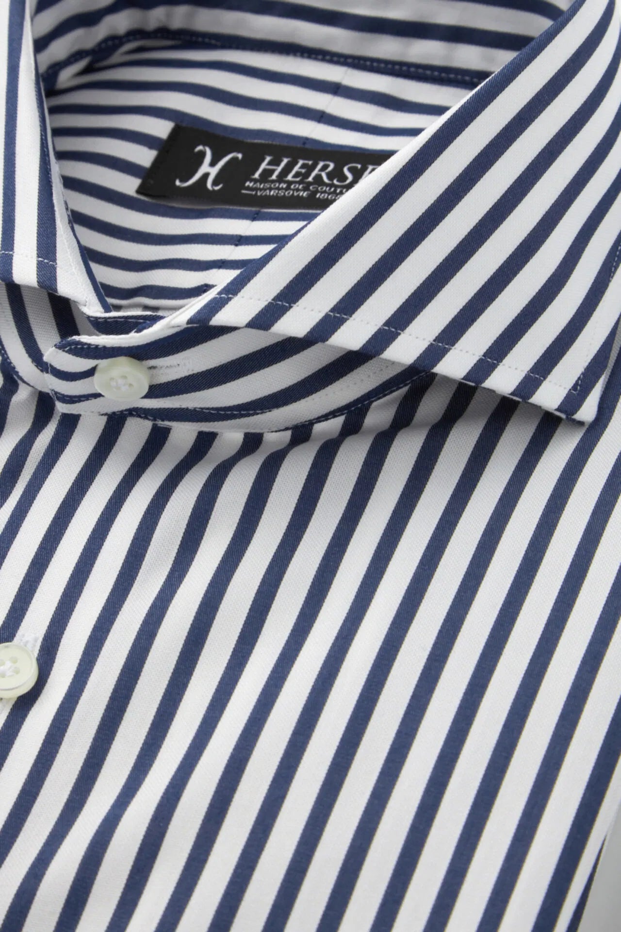 Chemise bleu marine et blanc à rayures fines distinctives, avec poignets arrondis, pli plat et col rabattu. Confectionnée en 100 % coton Albini (120/135 g/m²) avec une construction en sergé Oxford, elle a été soigneusement confectionnée en Pologne, gage de qualité supérieure.