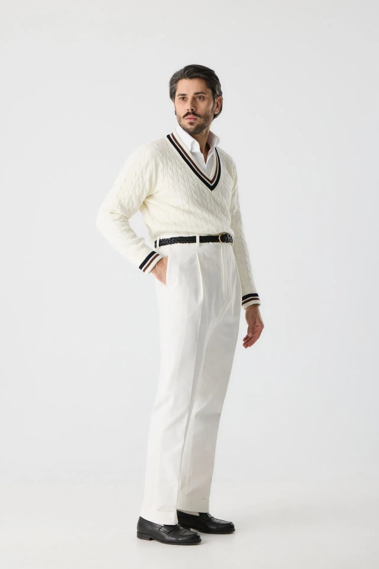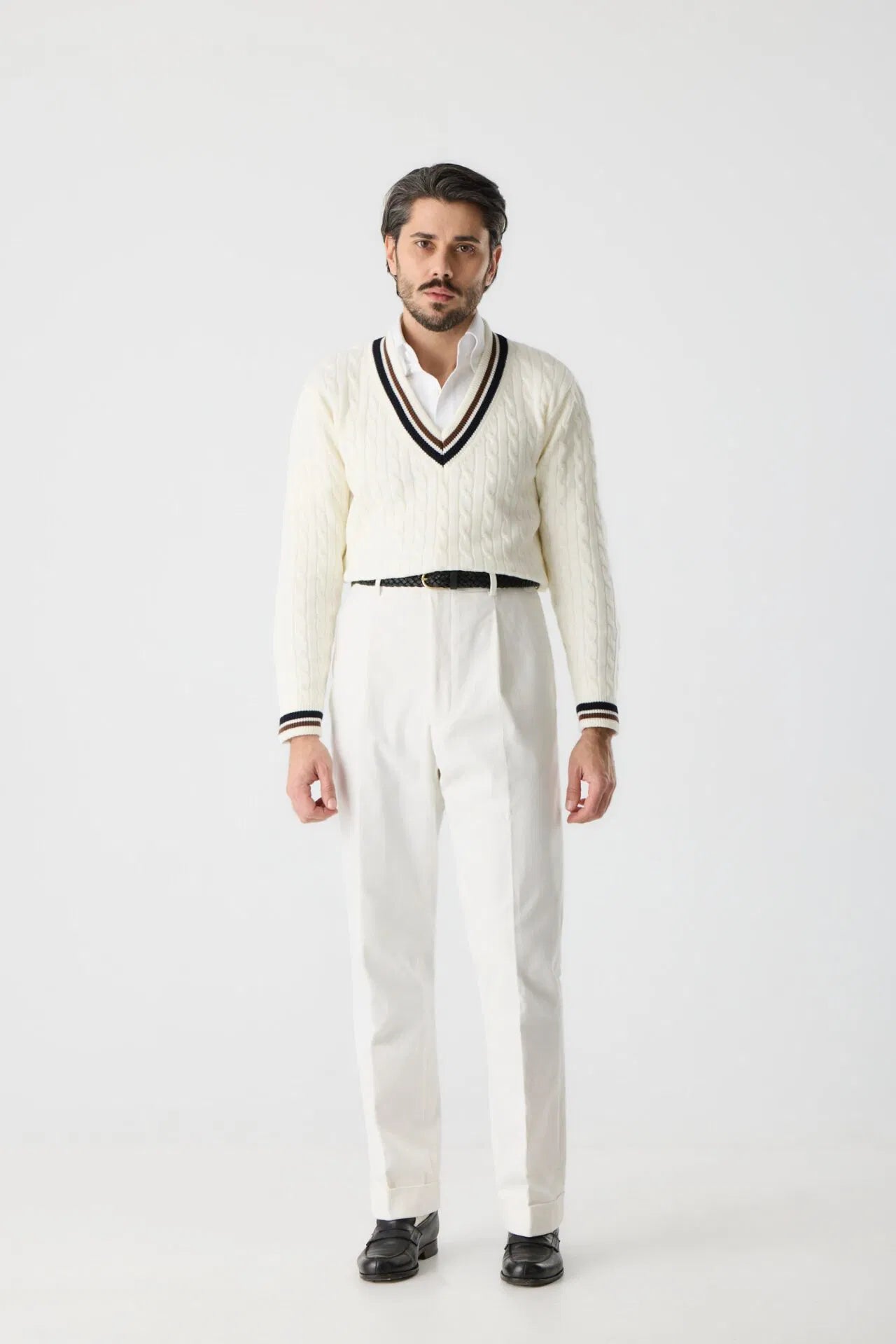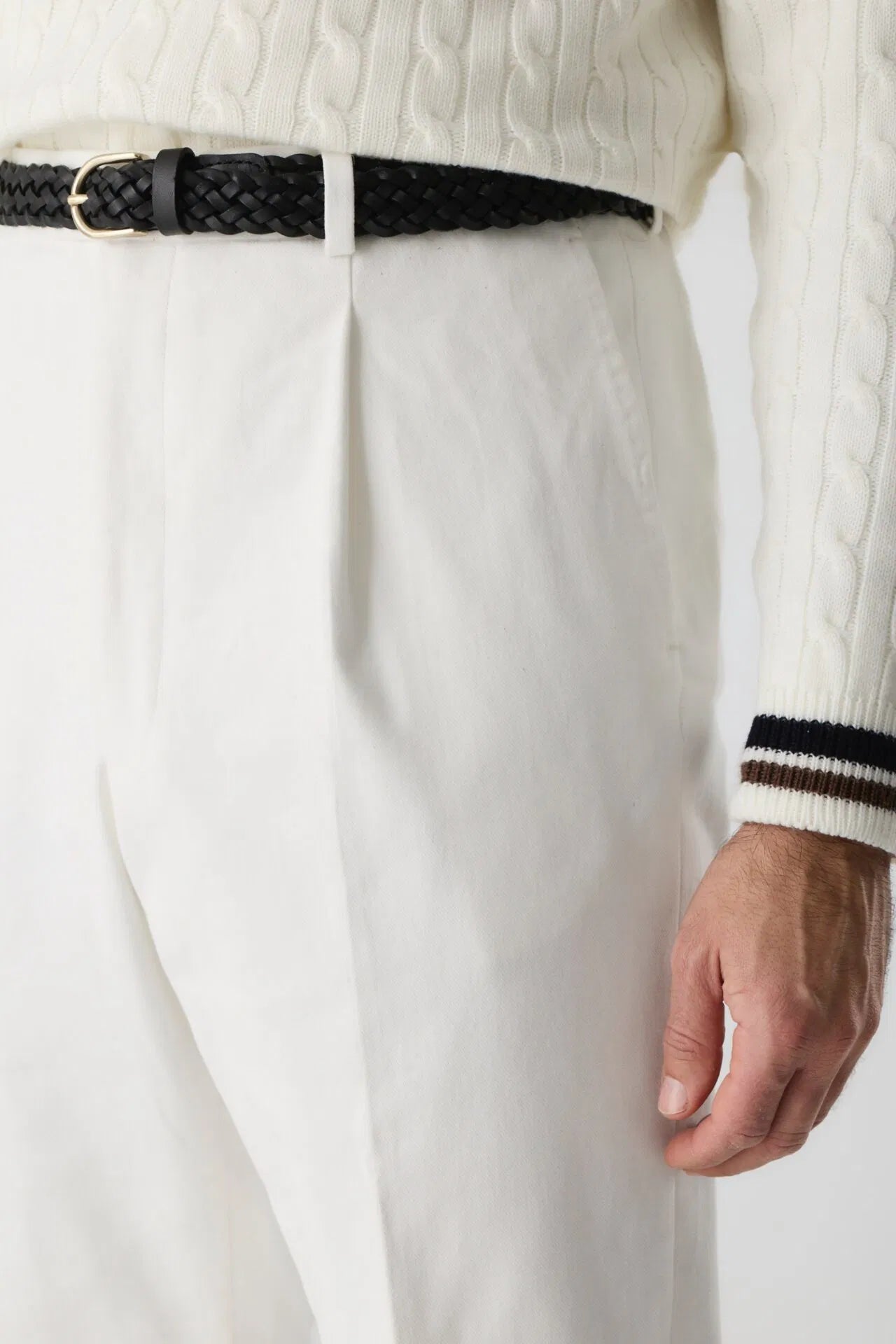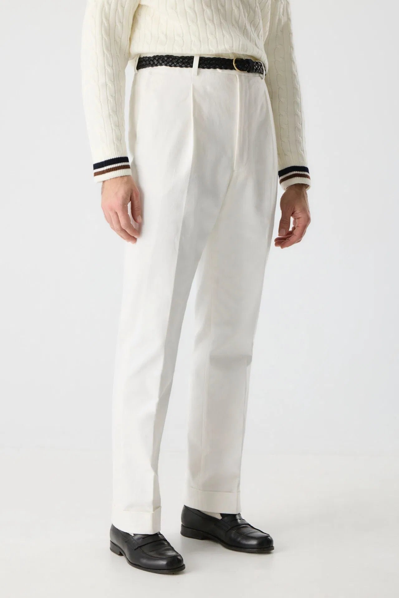 Spodnie wykonane są z tkaniny od włoskiego Olimpiasa, skomponowanej z 99% bawełny oraz 1% elastanu o gramaturze 305g. Te bawełniane spodnie to idealna opcja na wszystkie mniej formalne okazje – doskonale sprawdzą się w zestawieniach utrzymanych w estetyce preppy i ivy. Dostępne w dwóch wersjach kolorystycznych.