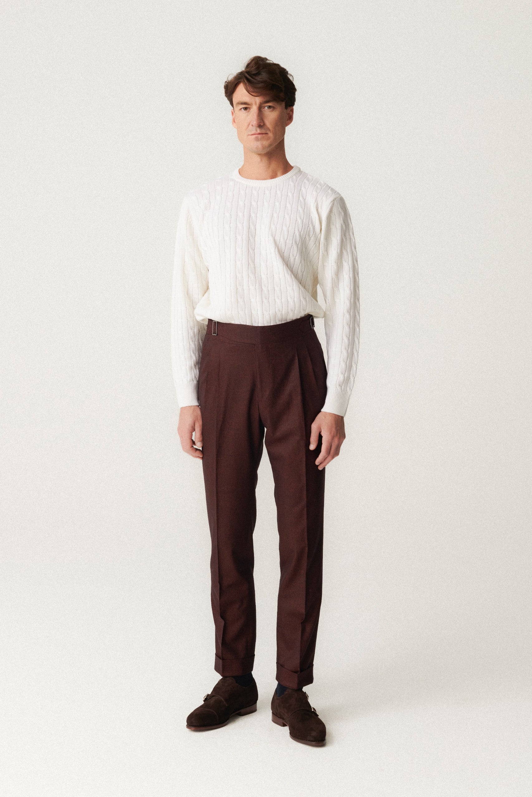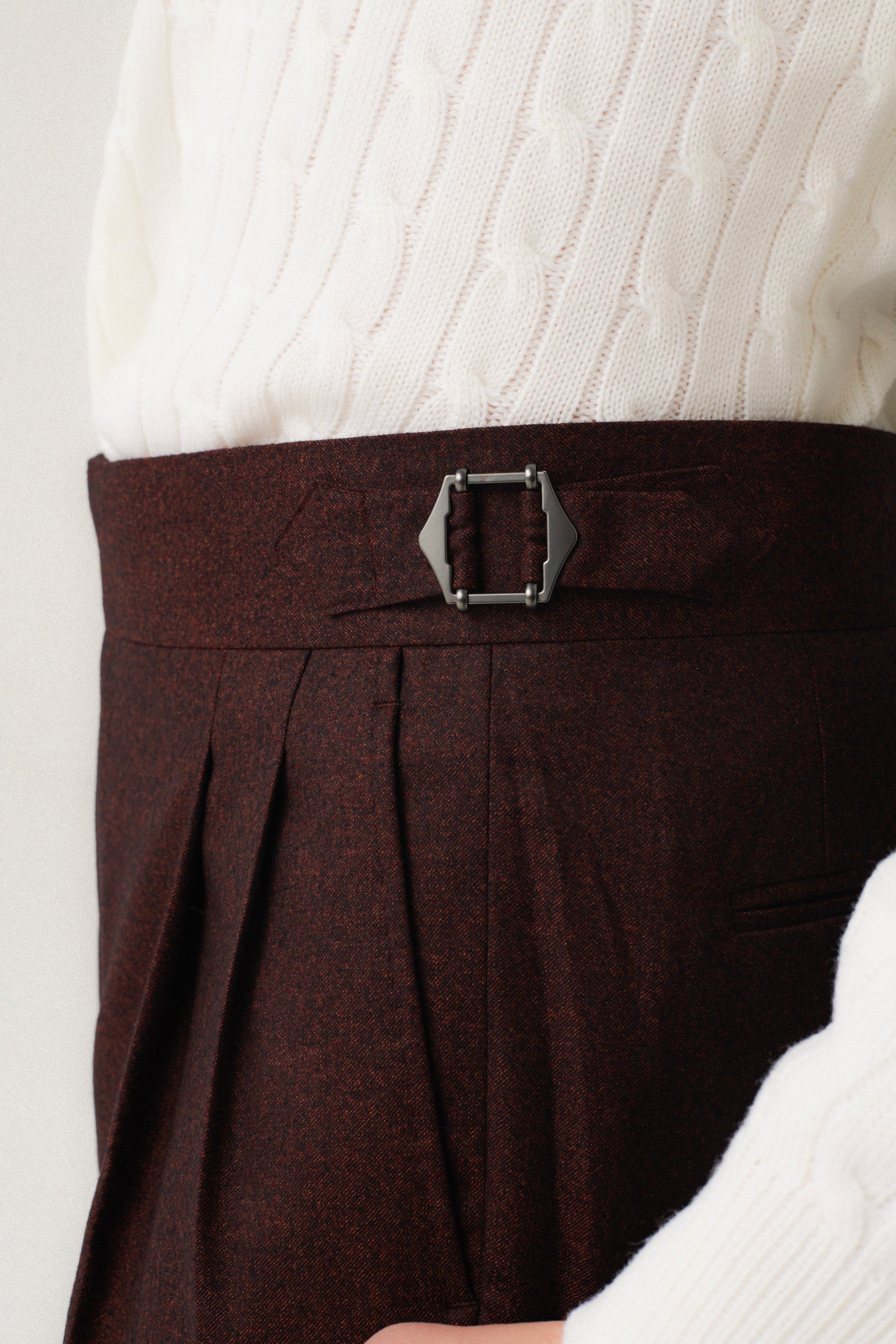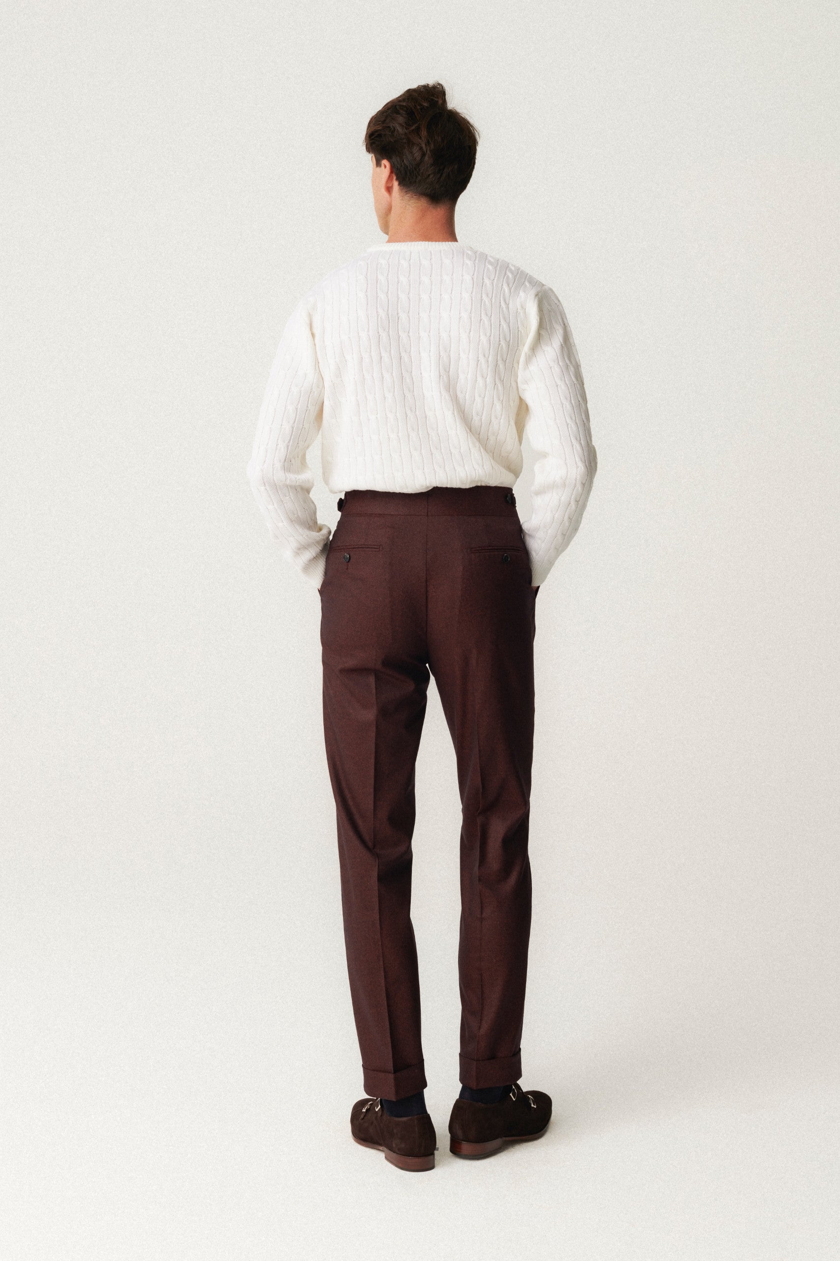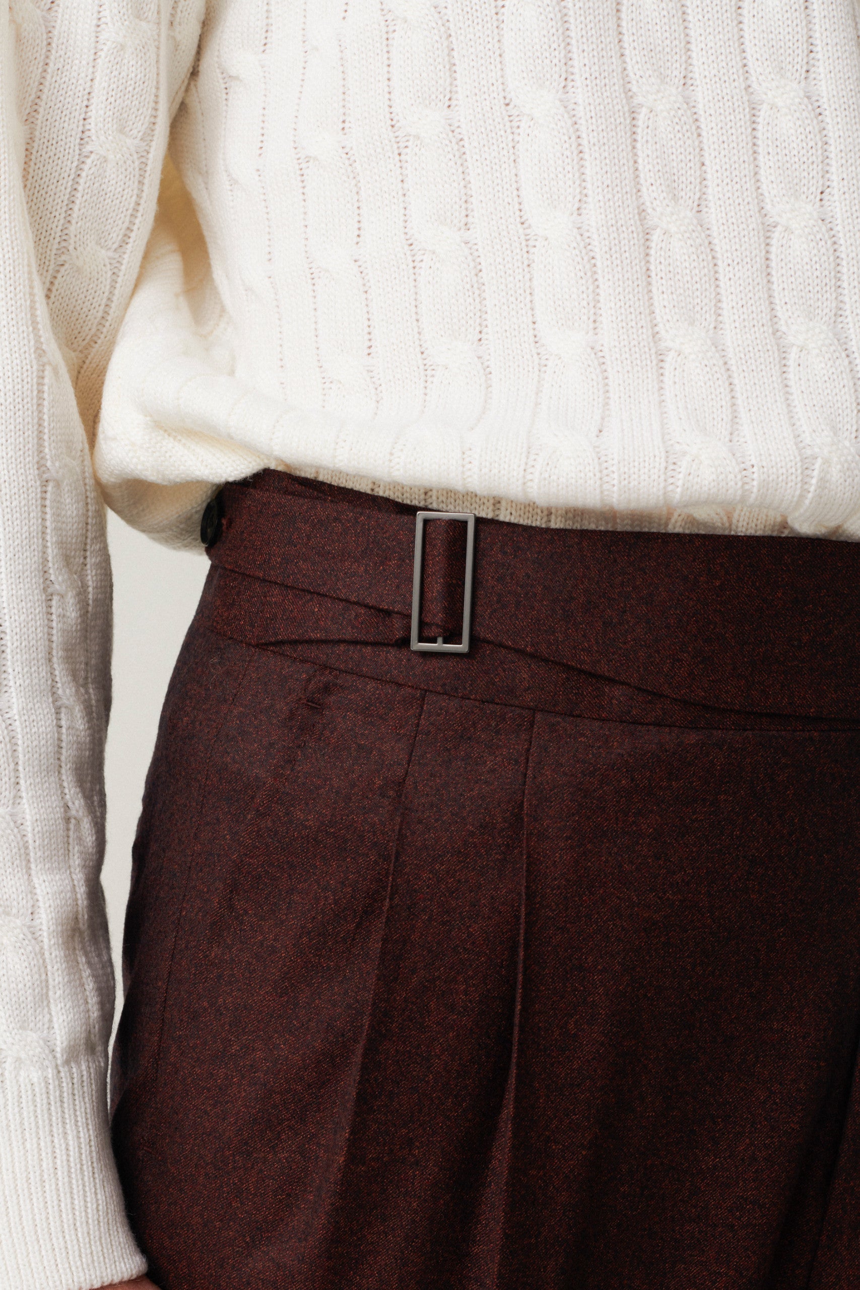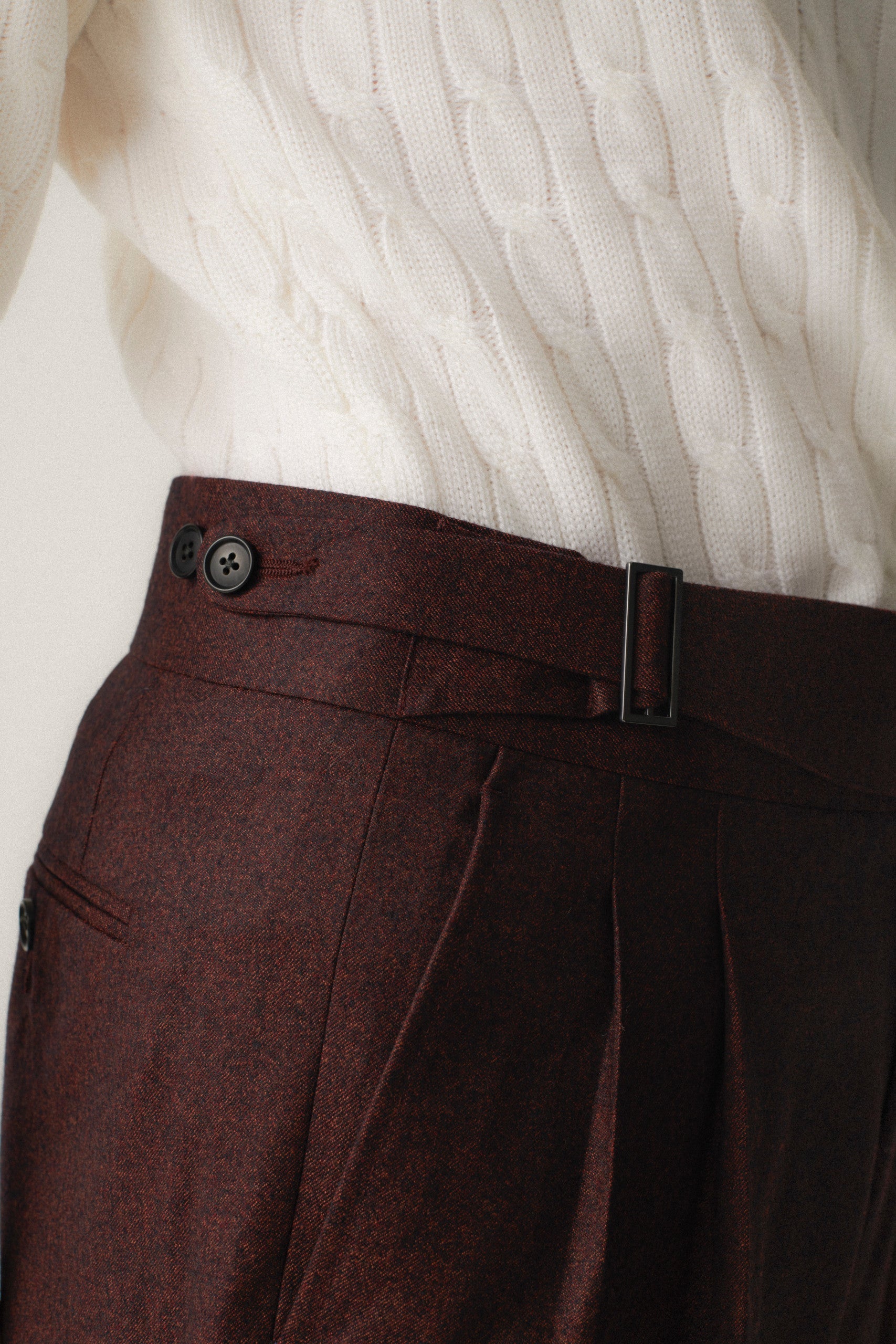 Karmazynowe flanelowe spodnie to elegancki i stylowy element garderoby wykonany z tkaniny VBC, z 100% wełny o gramaturze 270g. Ich intensywny kolor oraz miękka, flanelowa tekstura sprawiają, że są idealnym wyborem na bardziej formalne okazje, zapewniając jednocześnie wygodę noszenia.