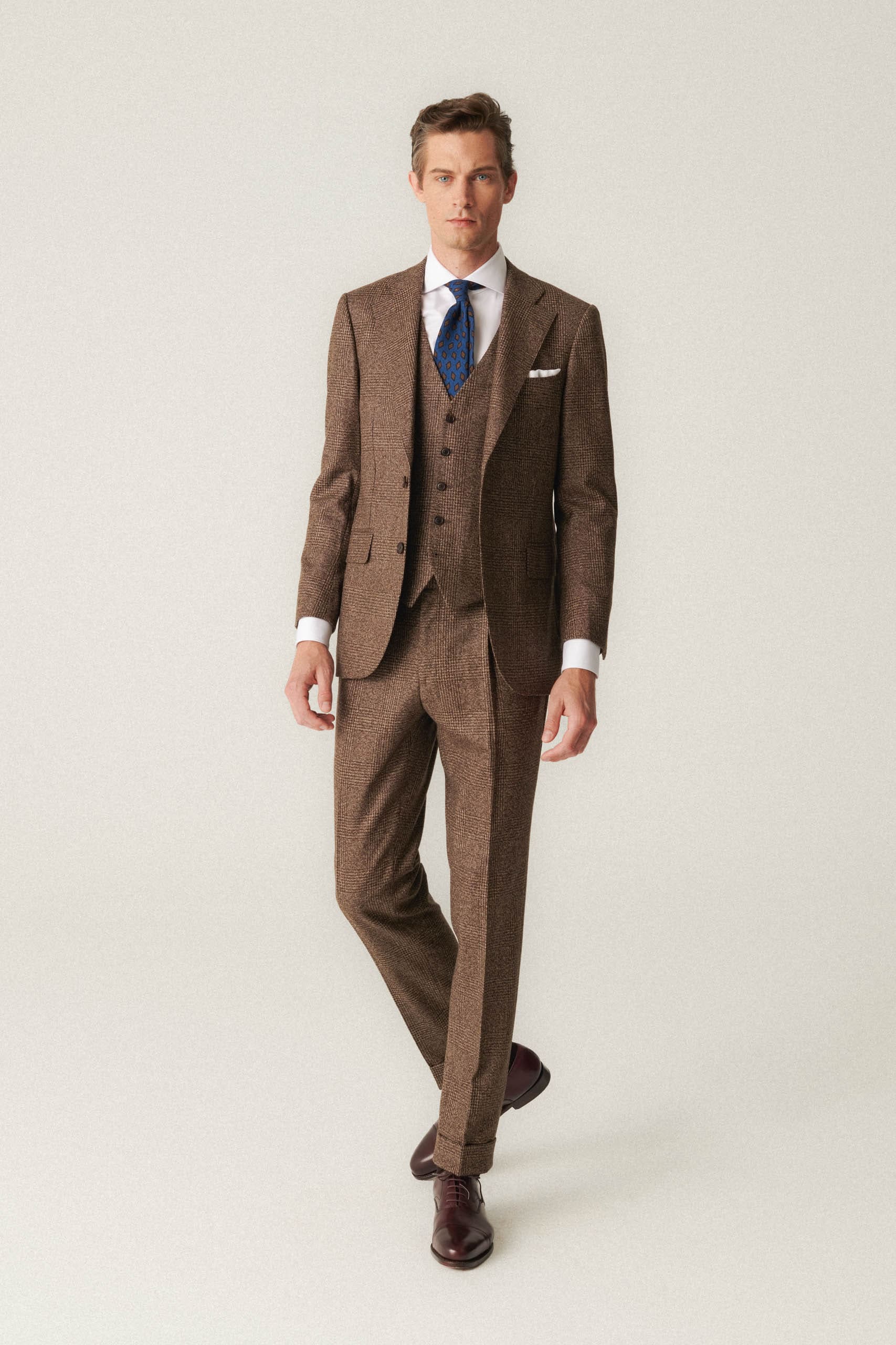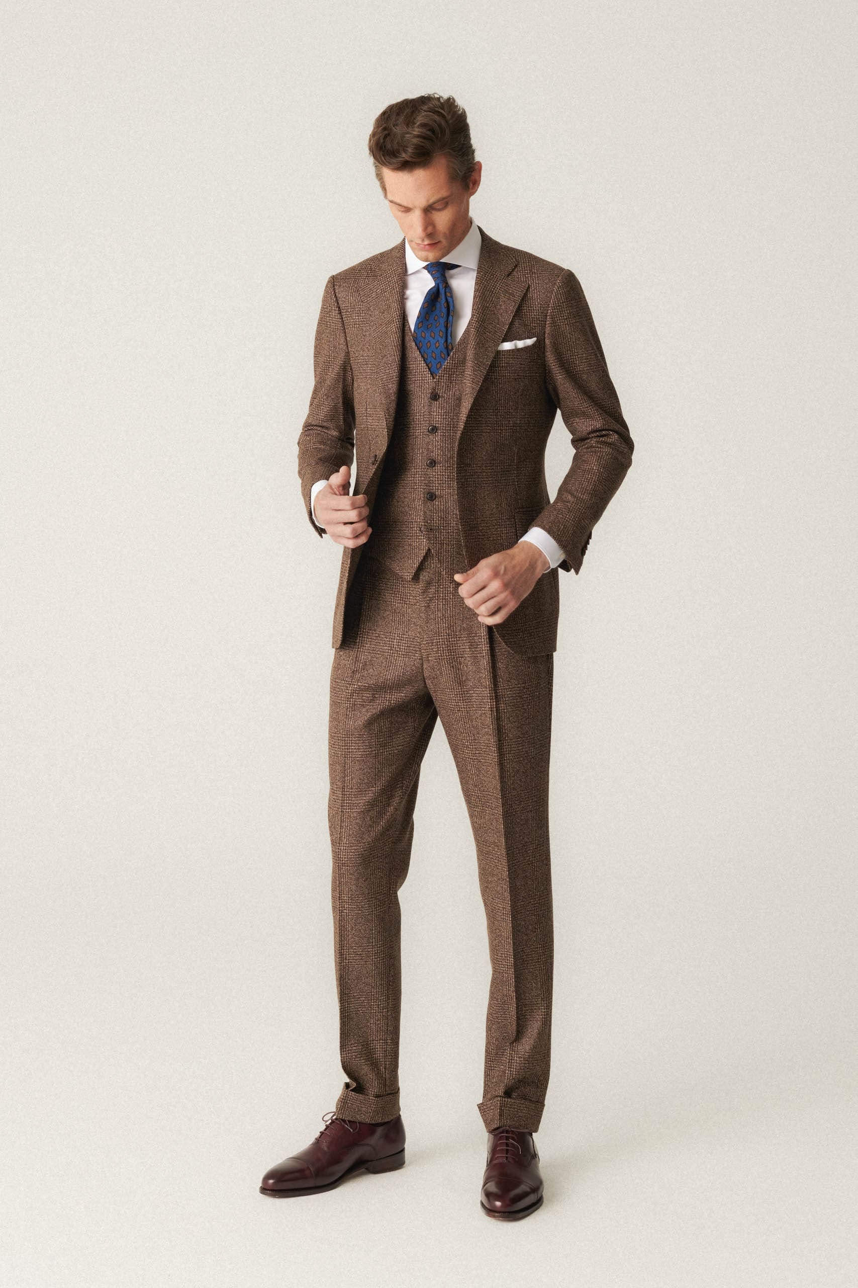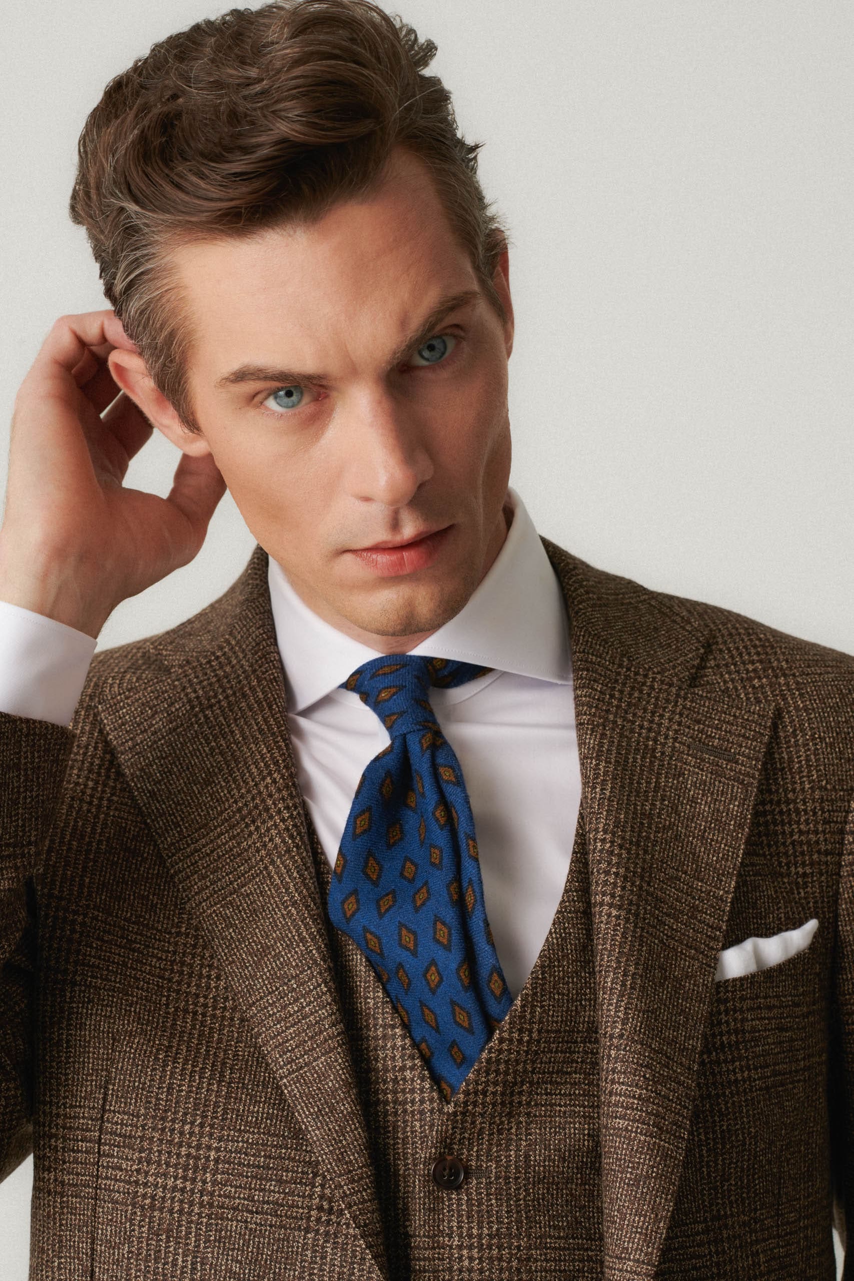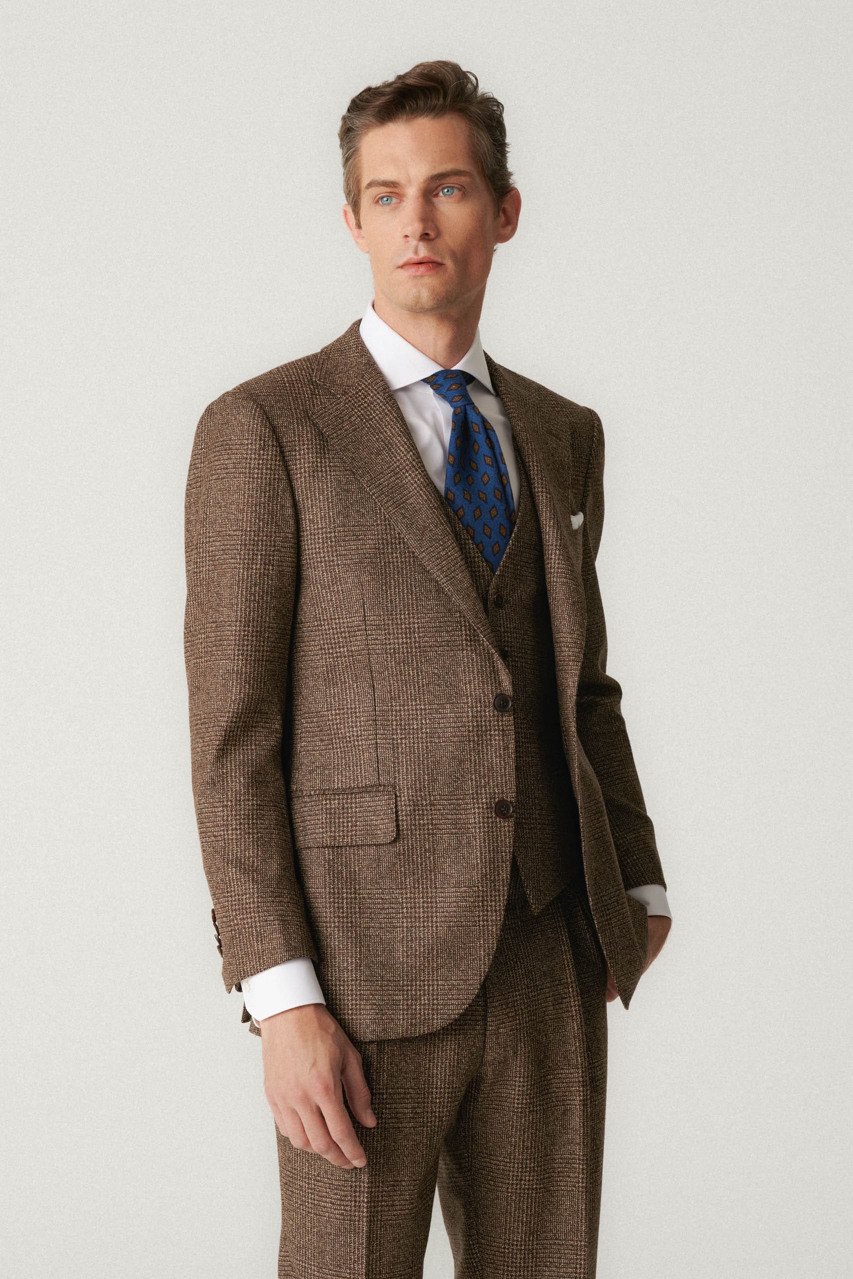 Garnitur trzyczęściowy Marling brązowy Prince of Wales to doskonały wybór dla mężczyzn, którzy cenią sobie elegancję, komfort oraz wysoką jakość wykonania.