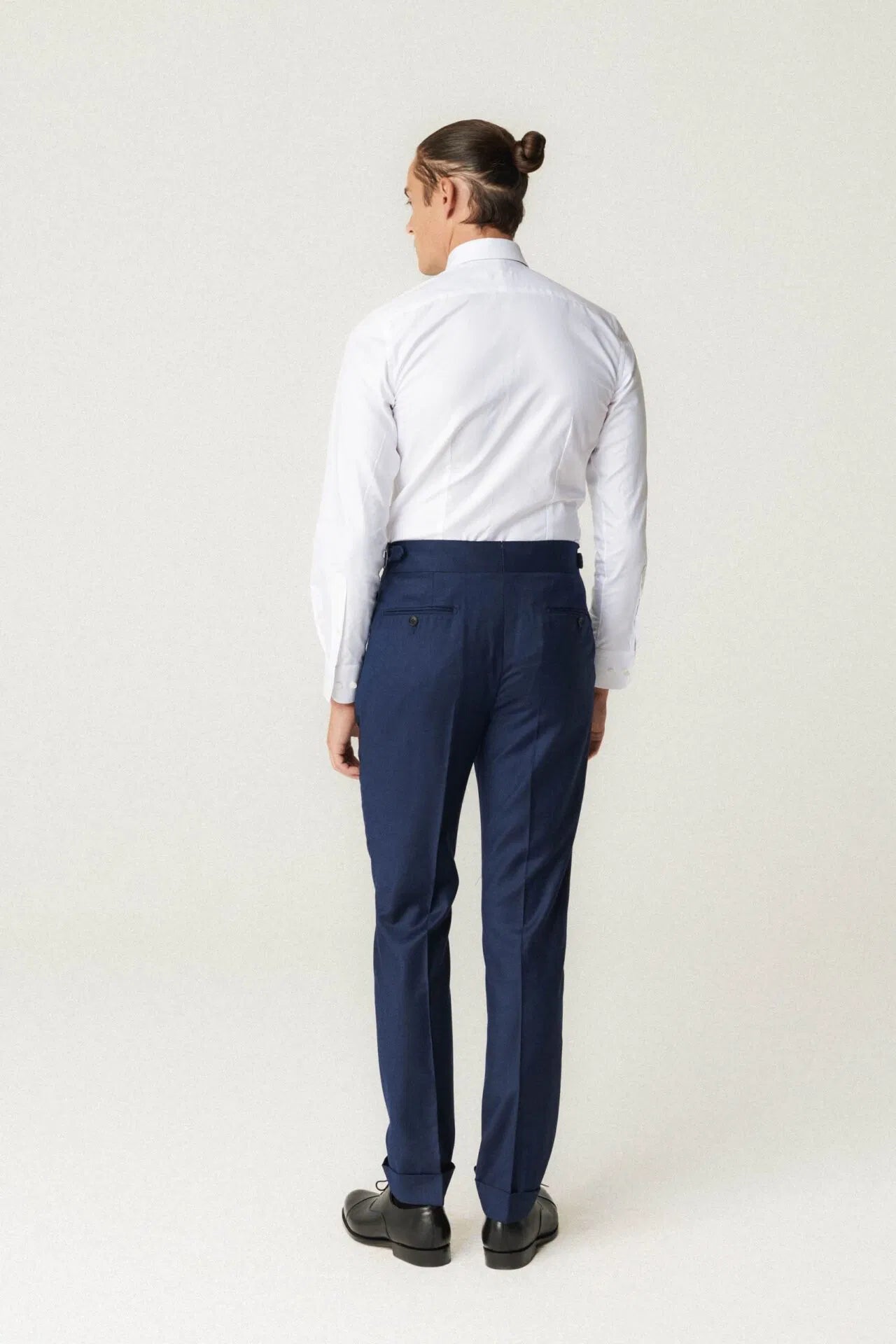 SPODNIE: boczny regulator, guziki na szelki, pojedyncze zakładki, mankiety,