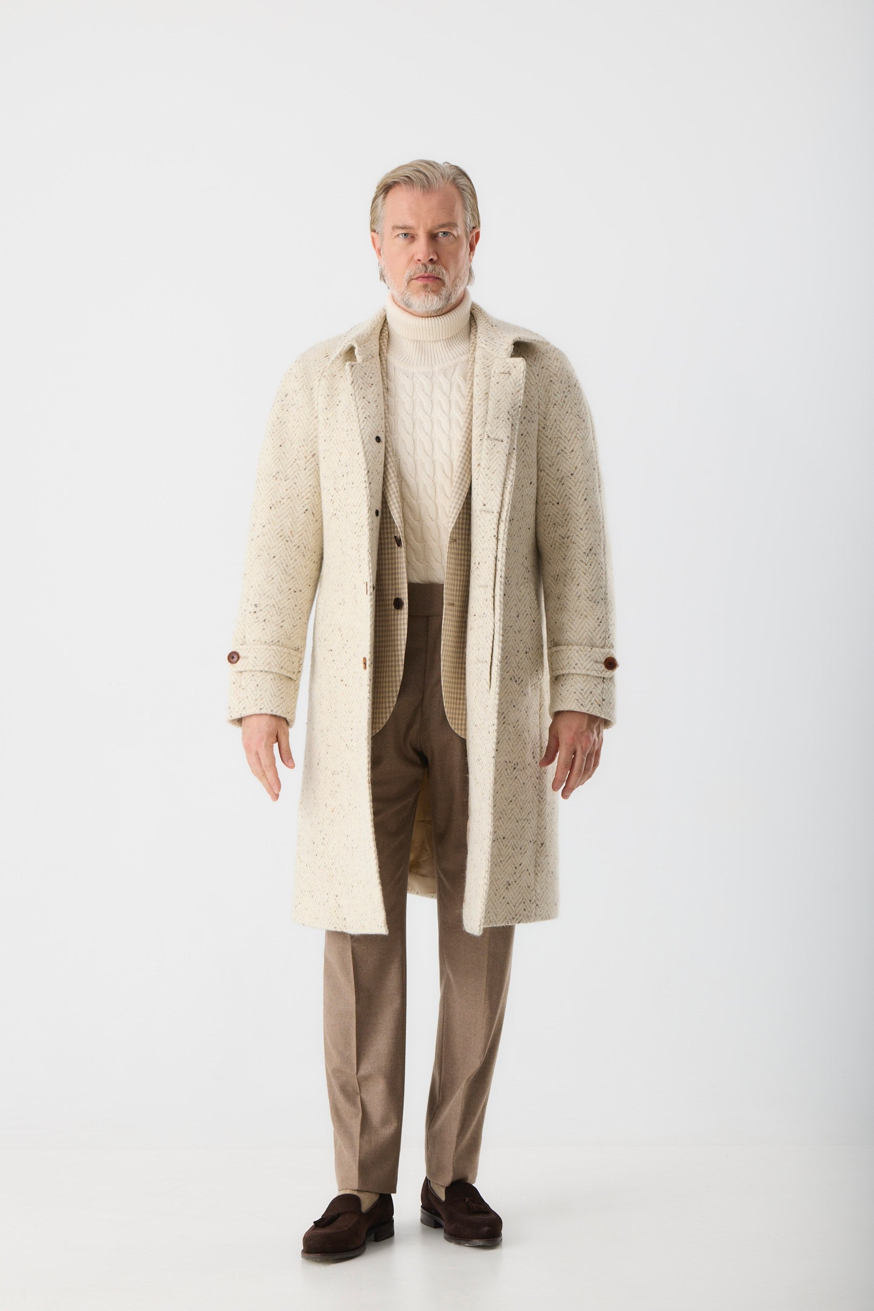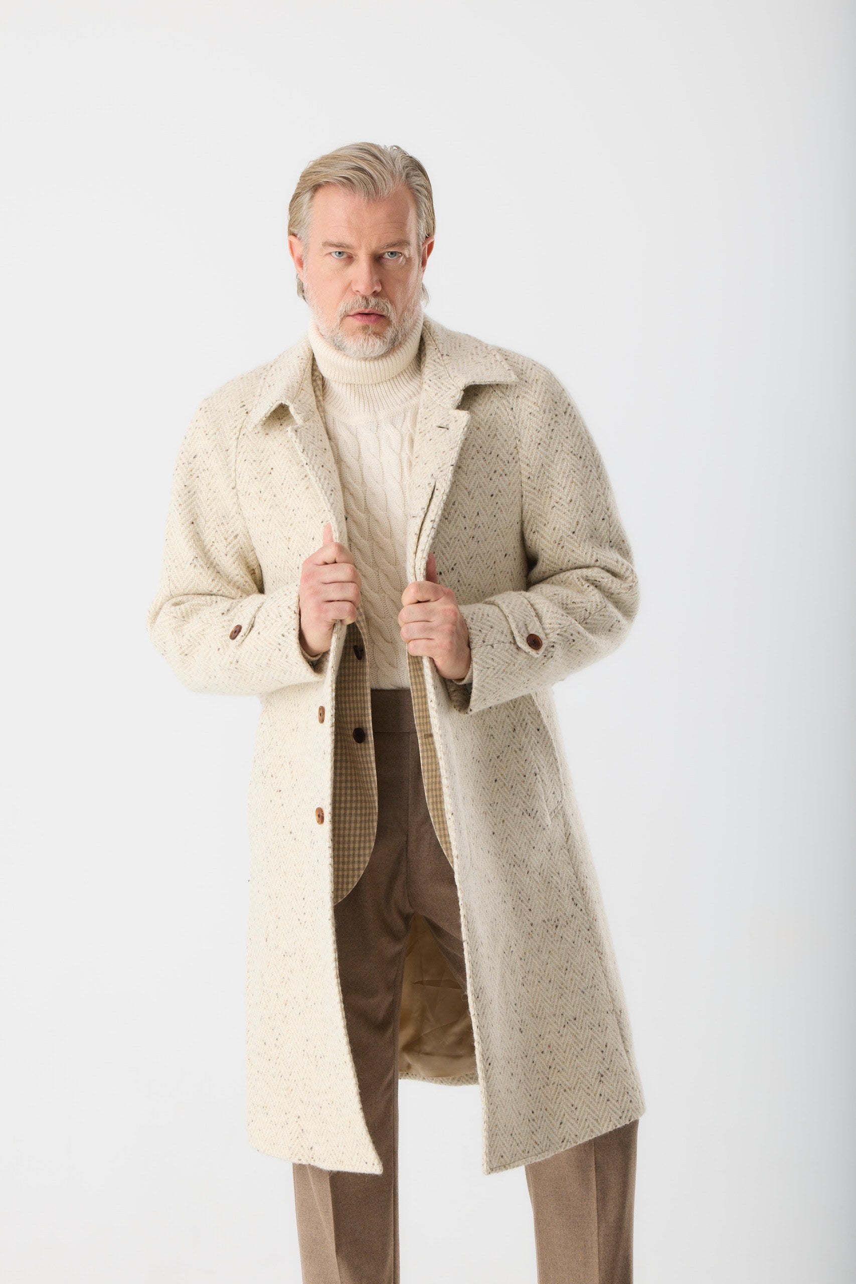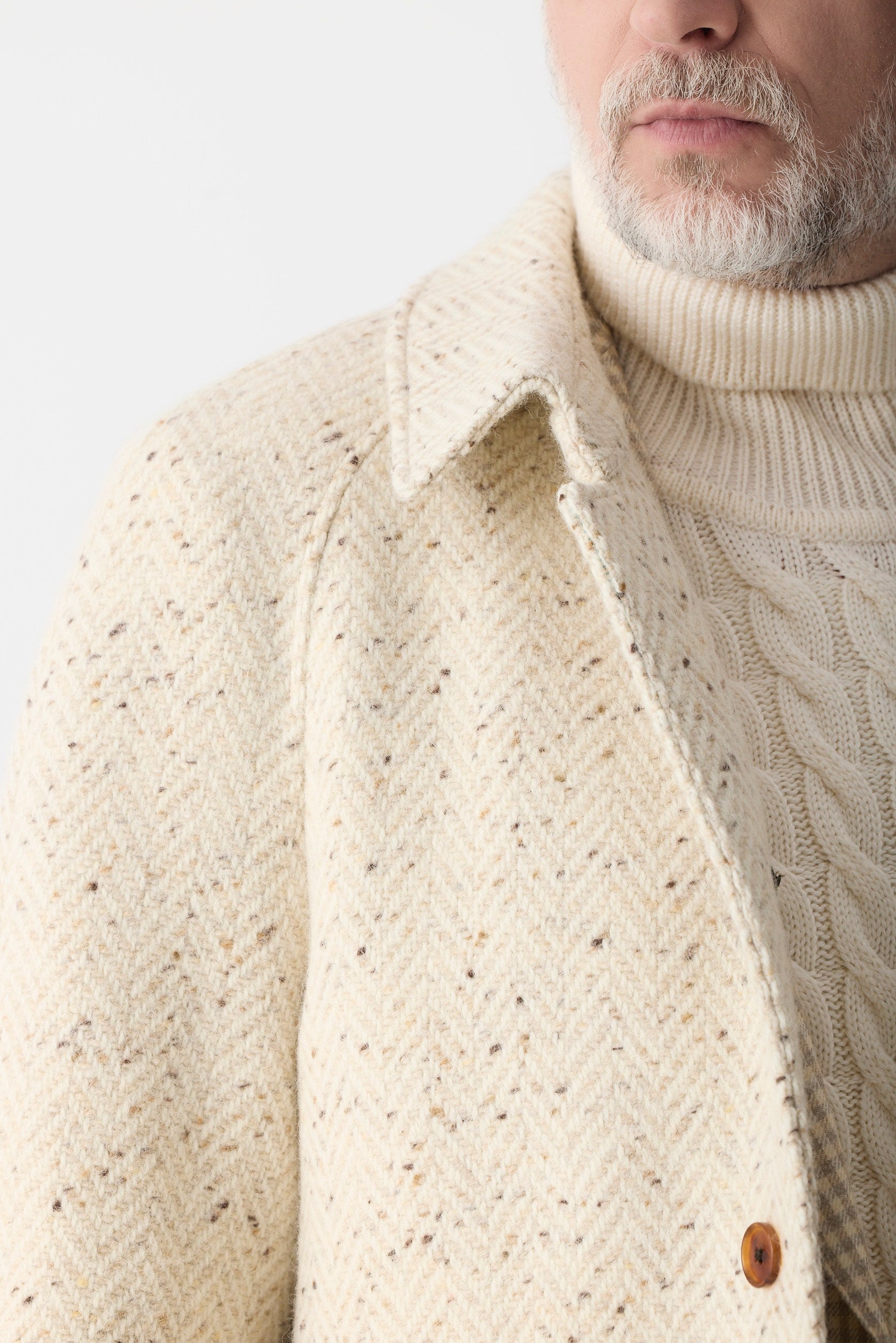 Jasnobeżowy płaszcz raglanowy z Donegal Tweedu