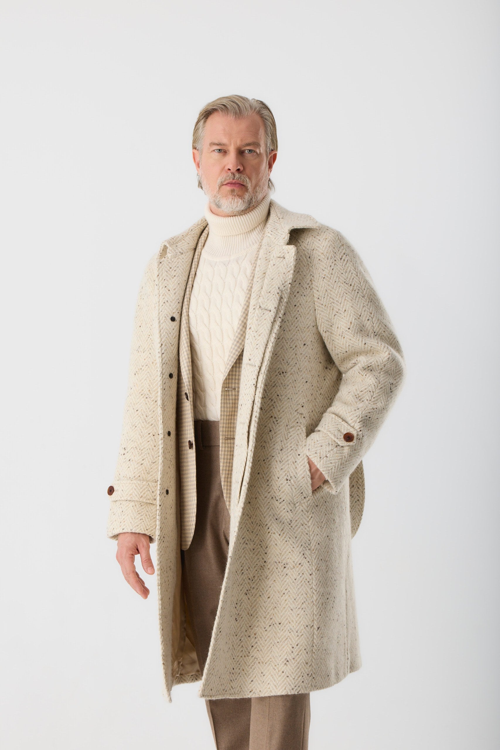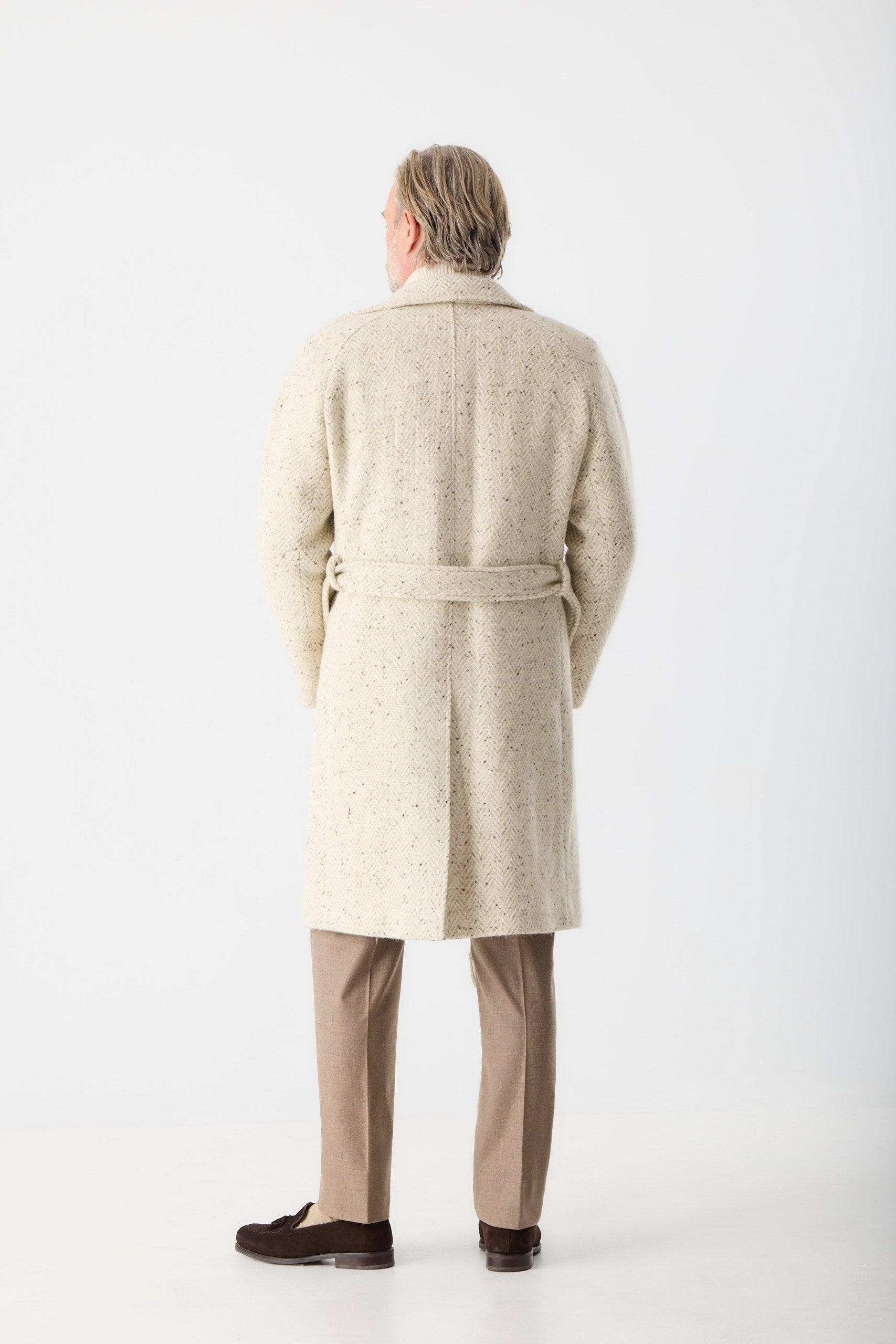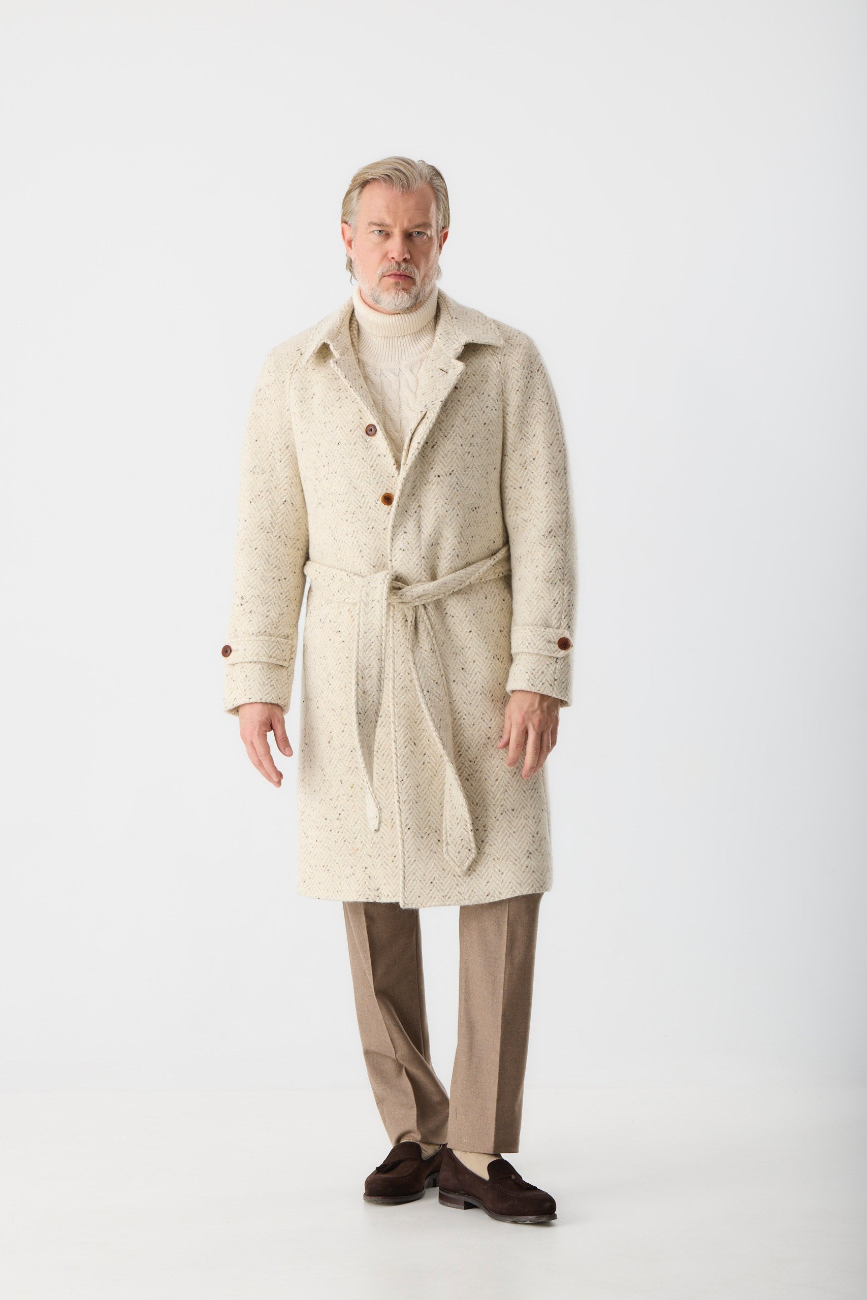Jasnobeżowy płaszcz raglanowy z Donegal Tweedu