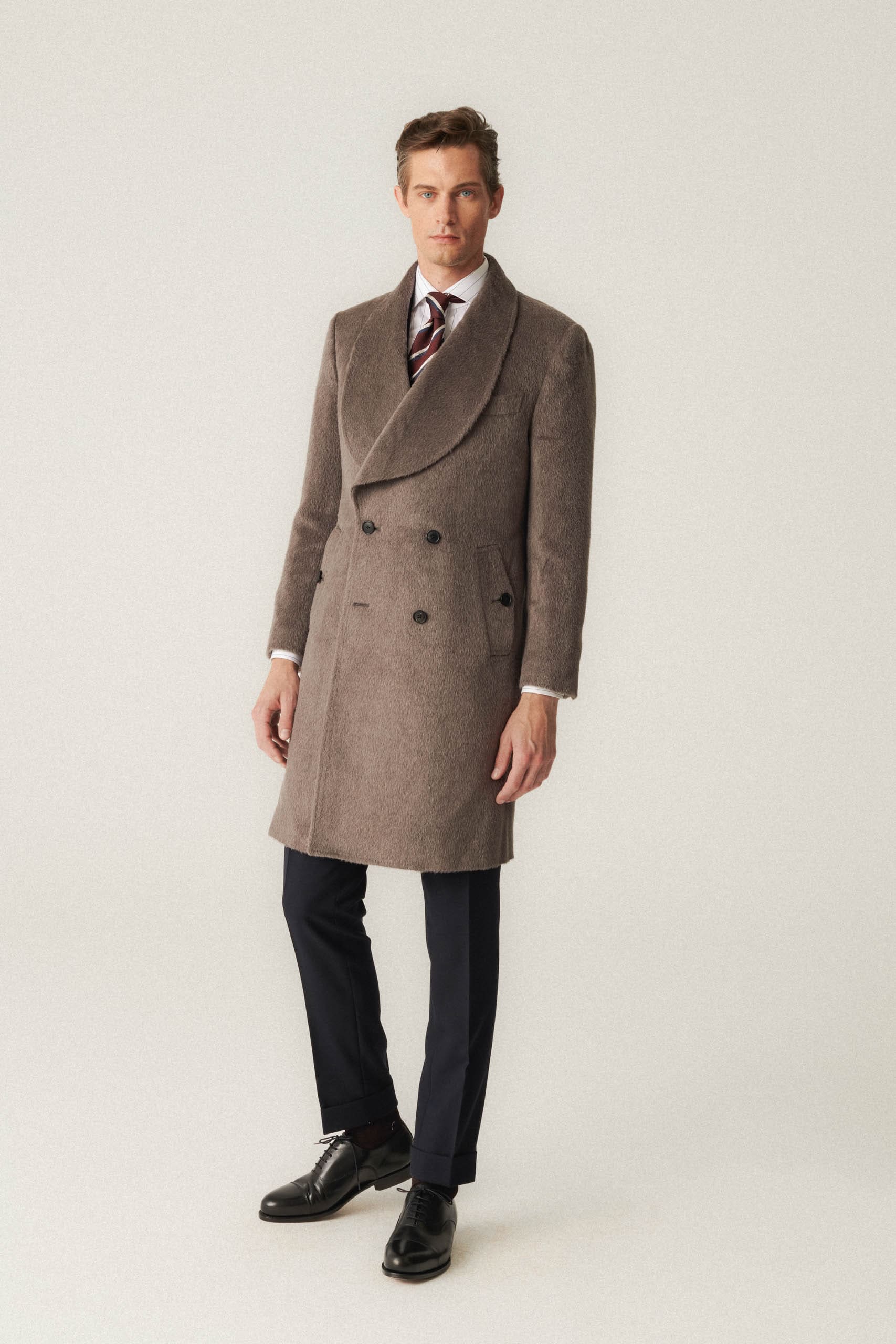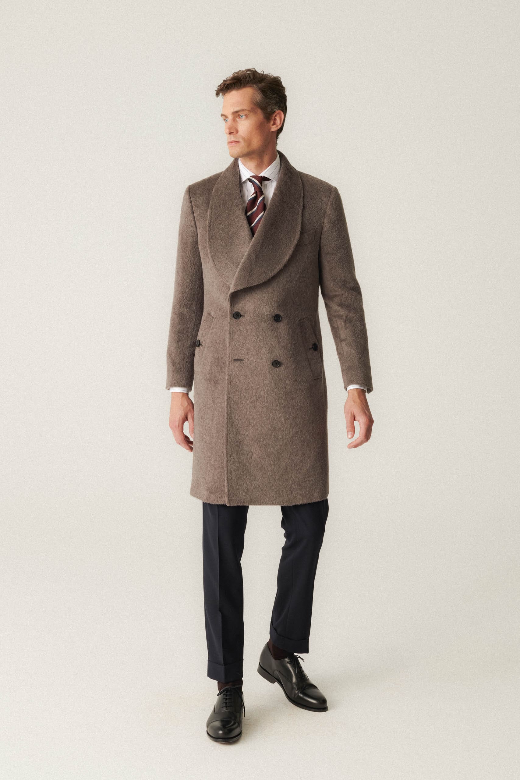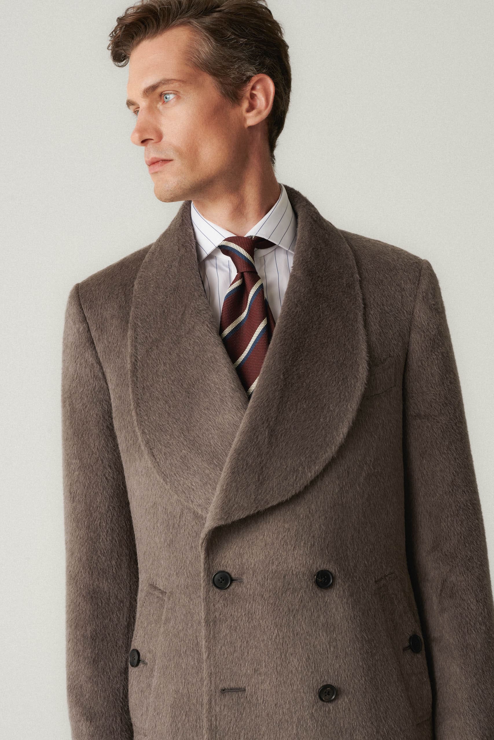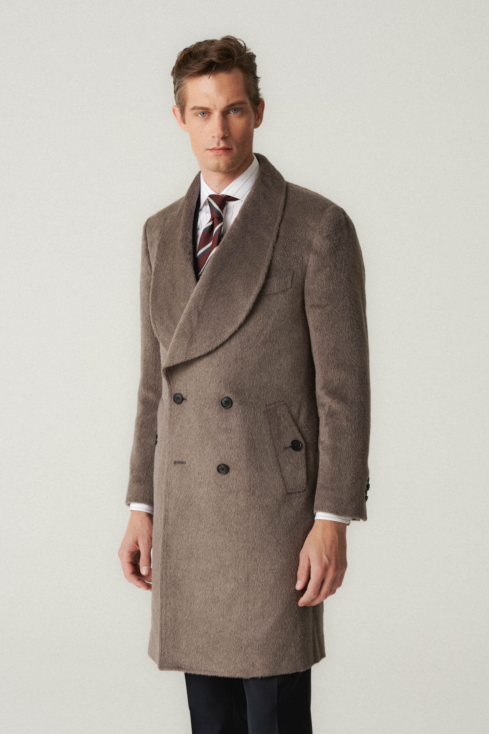 DETALE: skośne kieszenie, szalowy kołnierz, brustasza