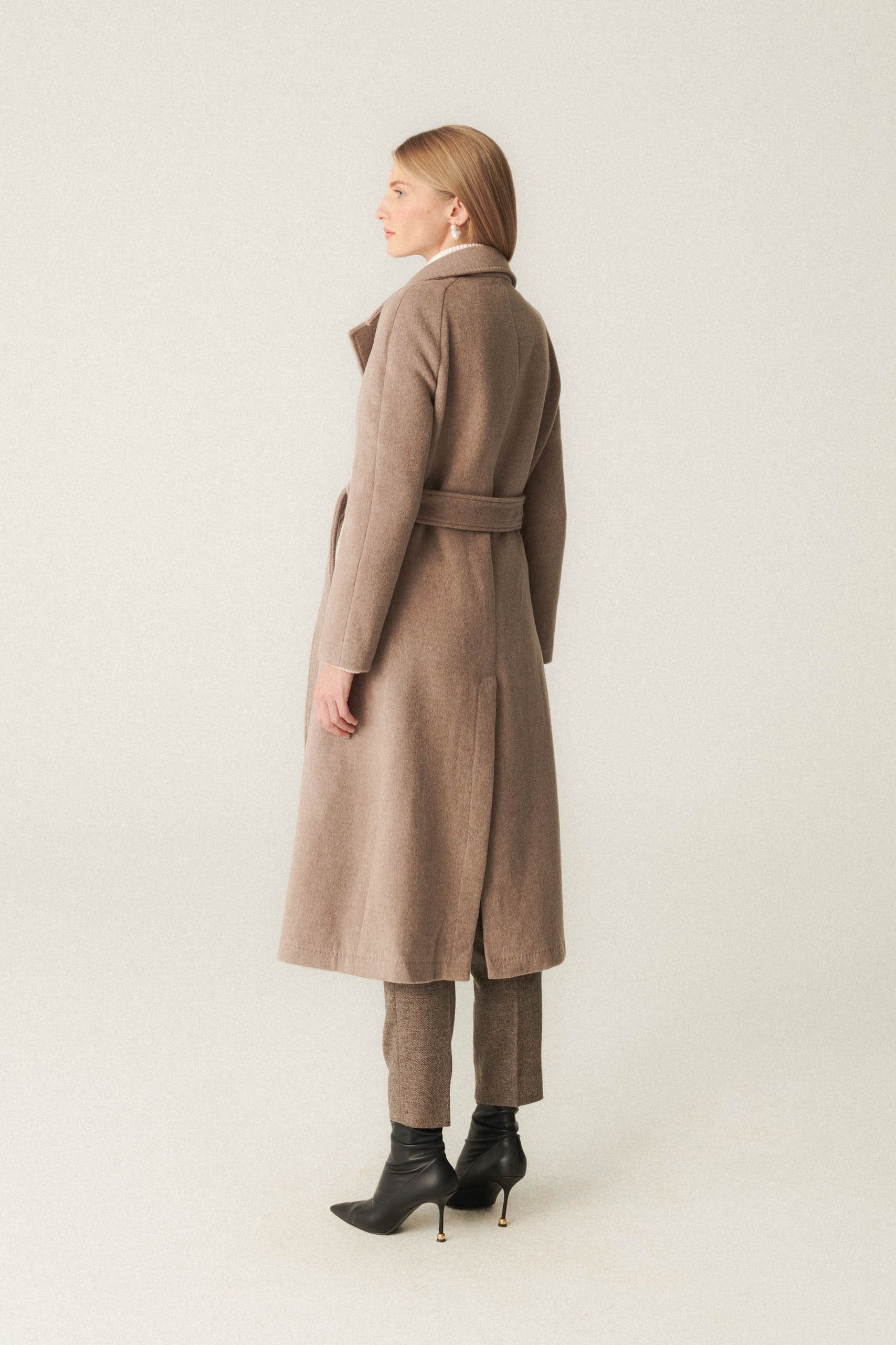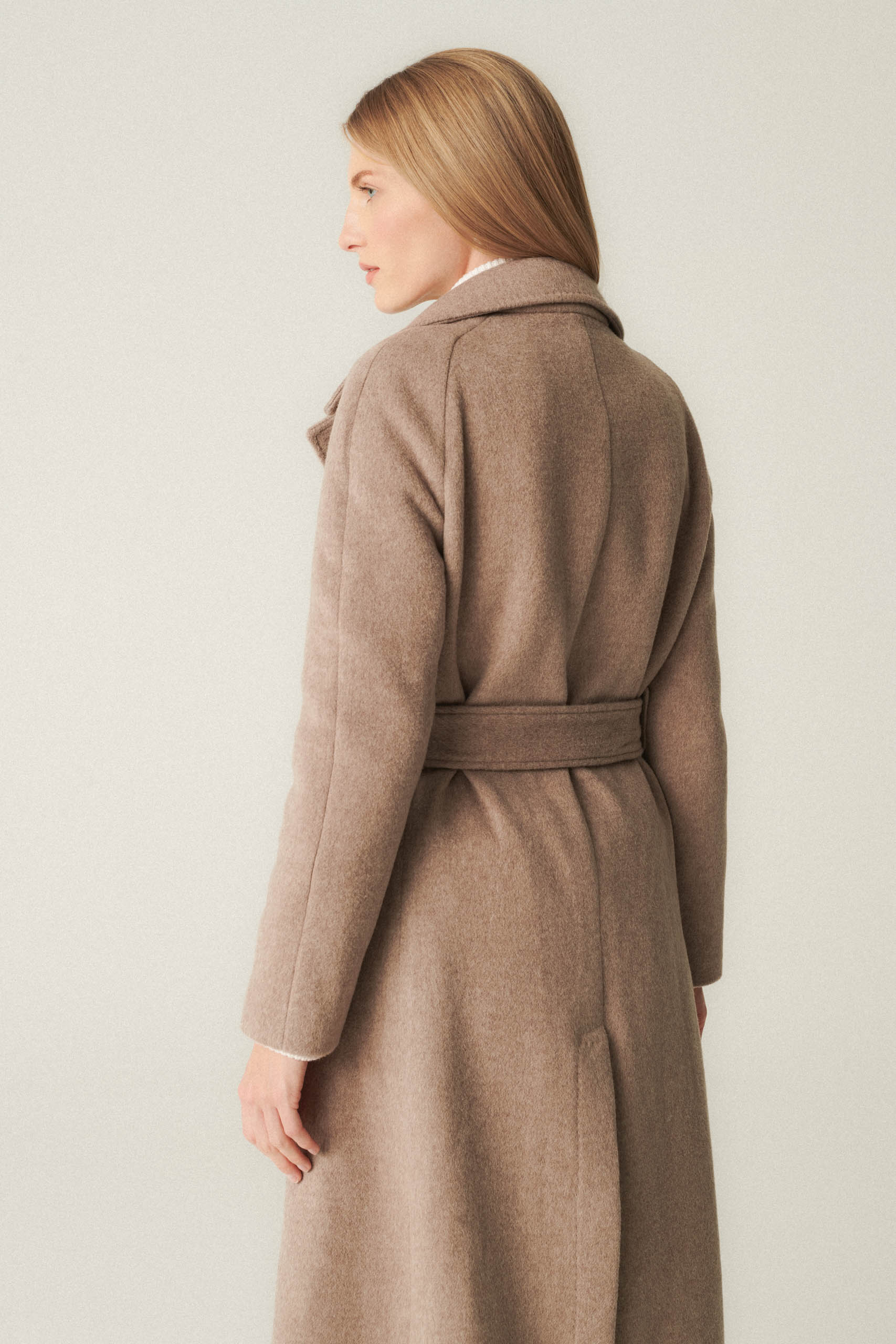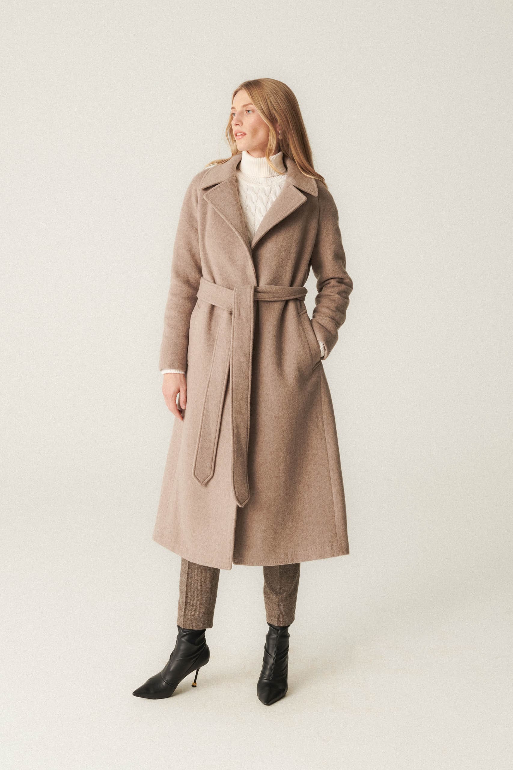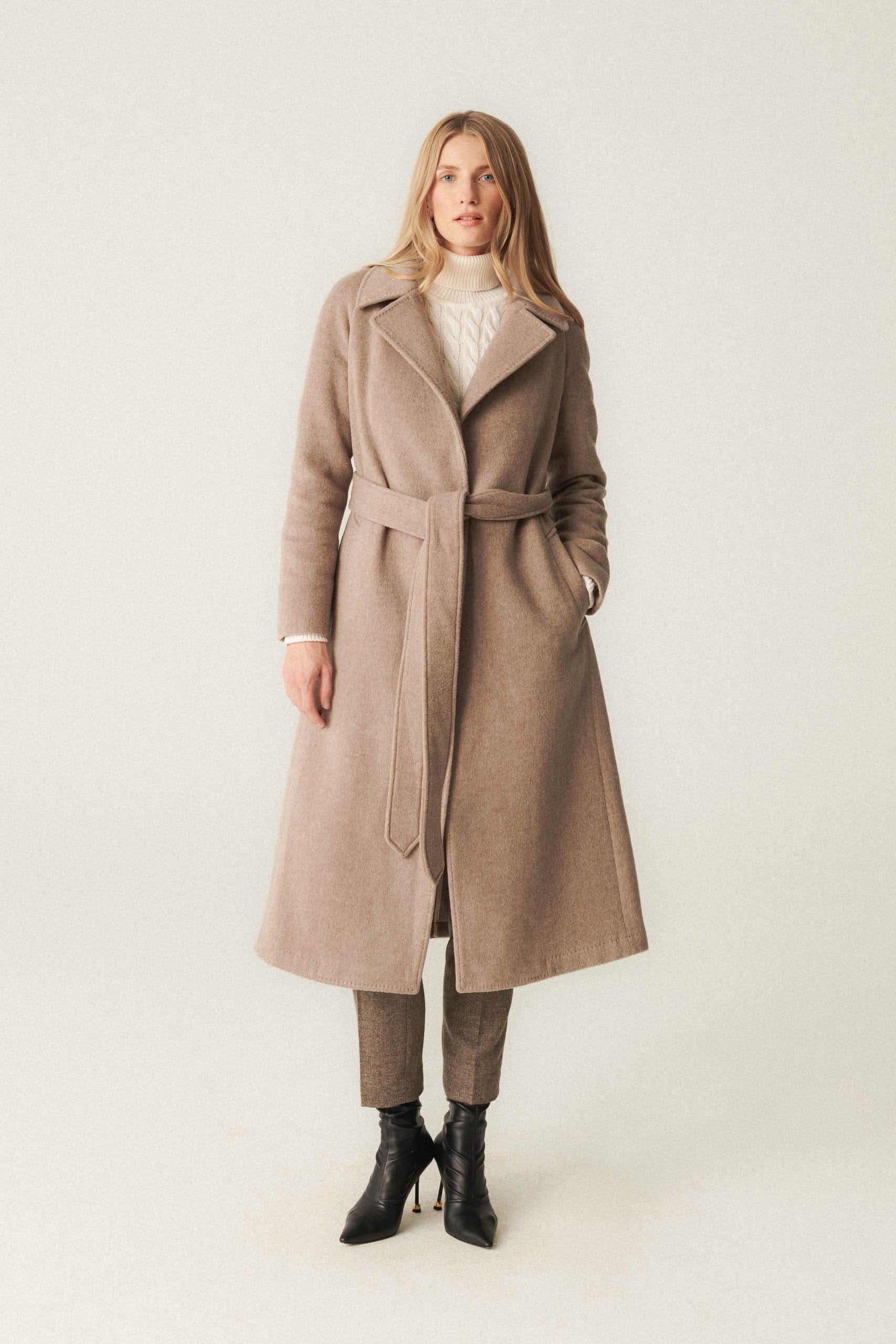 Beżowy płaszcz wykonany jest z mieszanki wełny z kaszmirem od renomowanej tkalni Piacenza. Jest nie tylko elegancki, ale także wyjątkowo ciepły i trwały ze względu na imponującą masę materiału wynoszącą 660 gramów. Szlafrokowy krój, jest niezwykle wygodną i uniwersalną propozycją. To idealny wybór na chłodniejsze dni.